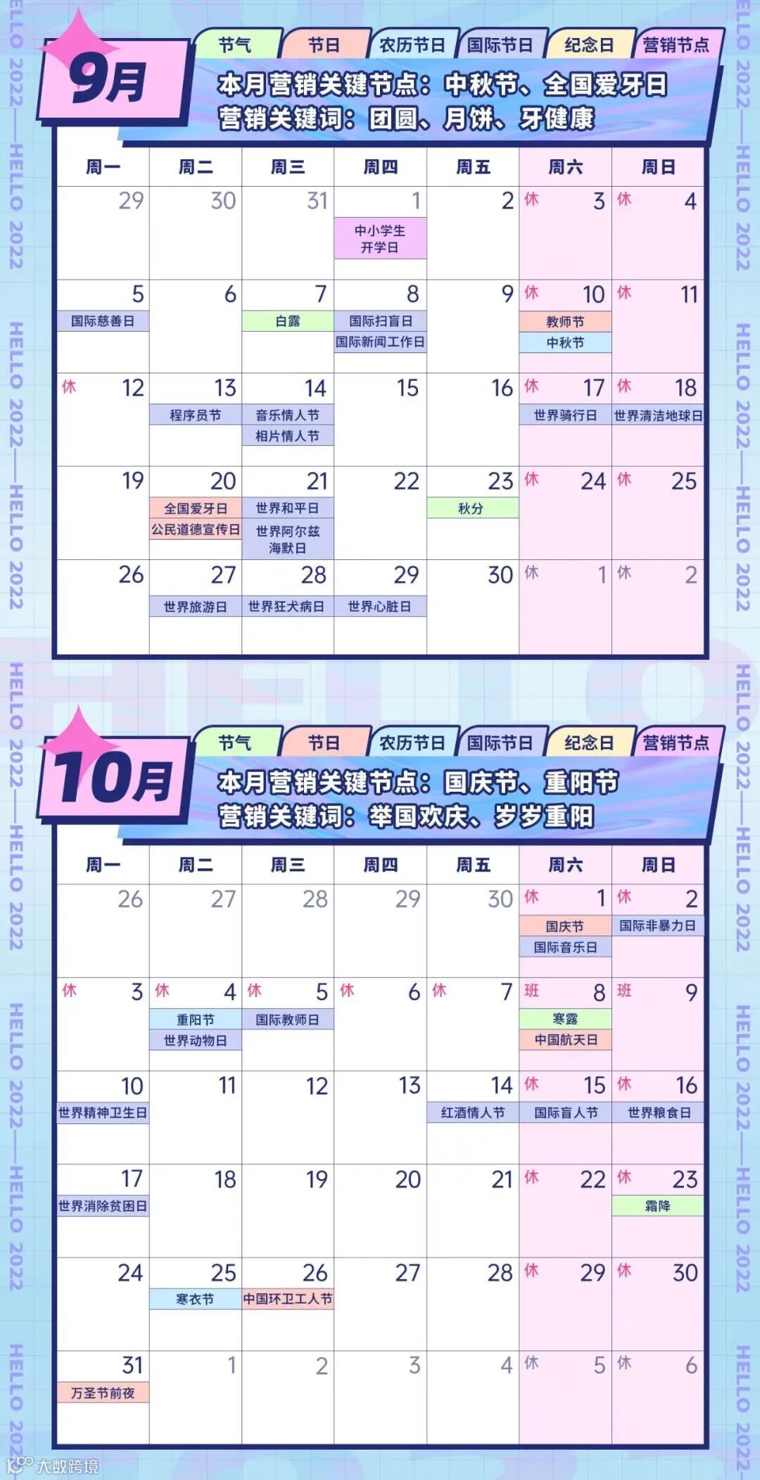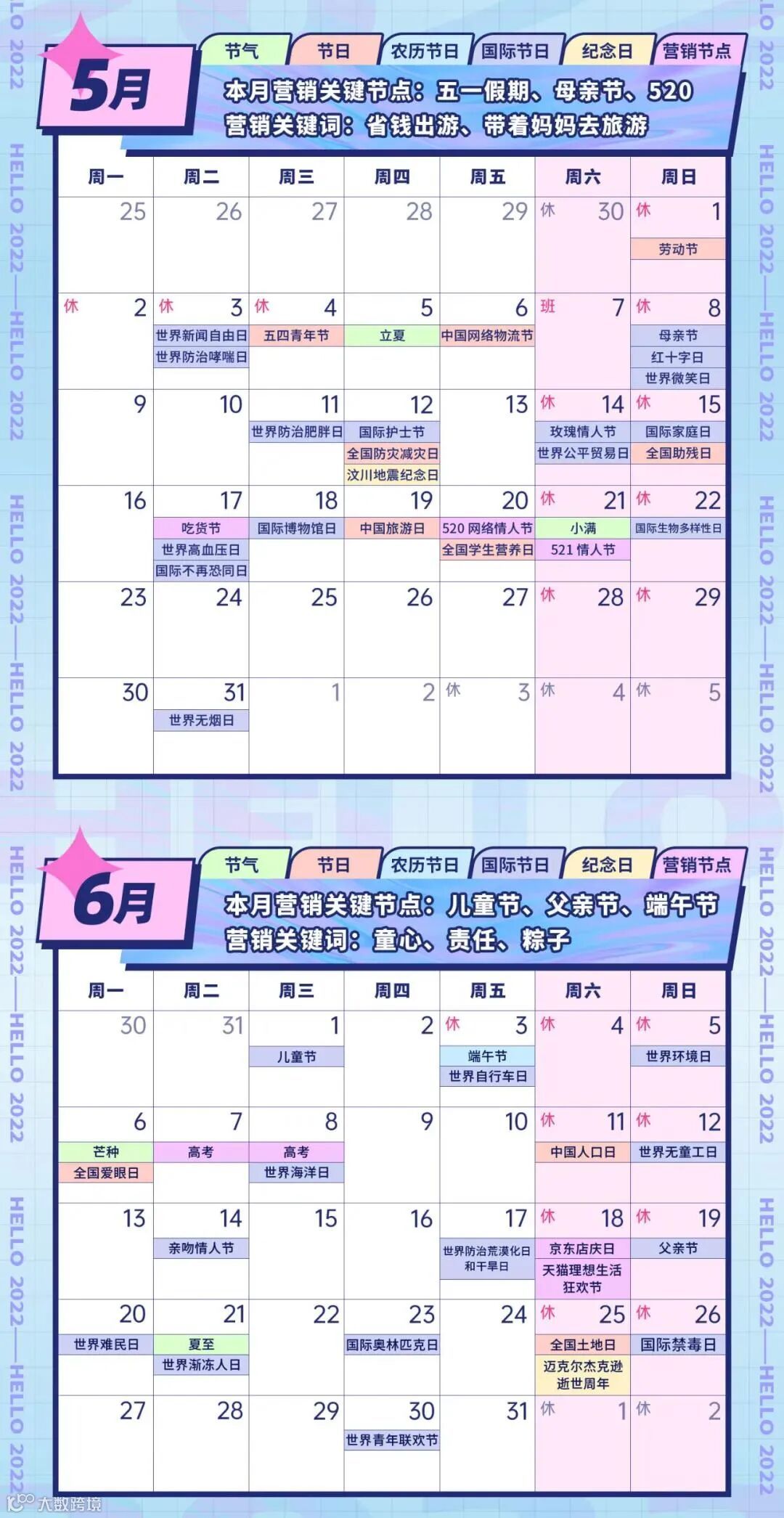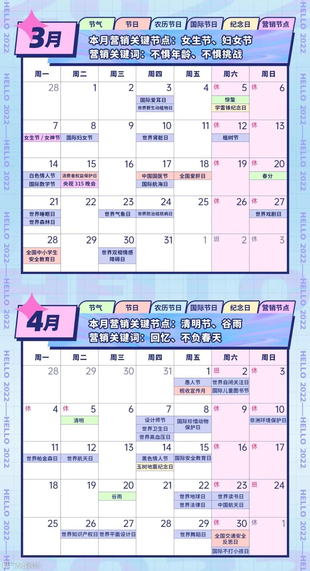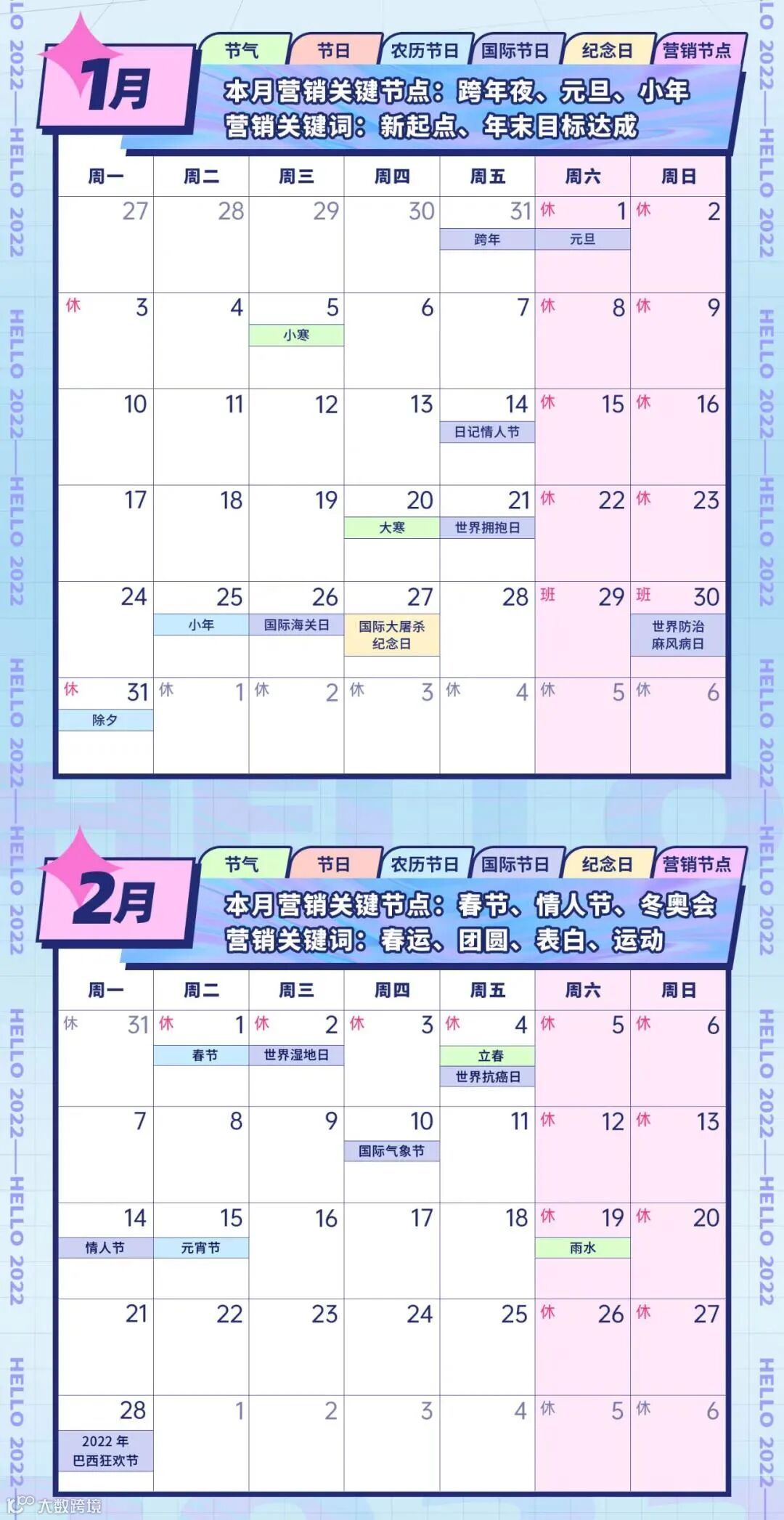 本文为各位小伙伴整理了“2022年全年营销热点日历”,包括了节日节气、纪念日、大事件,互联网热点等100+个营销节点,助力大家抓住机会,打破淡季魔咒,实现流量暴涨!