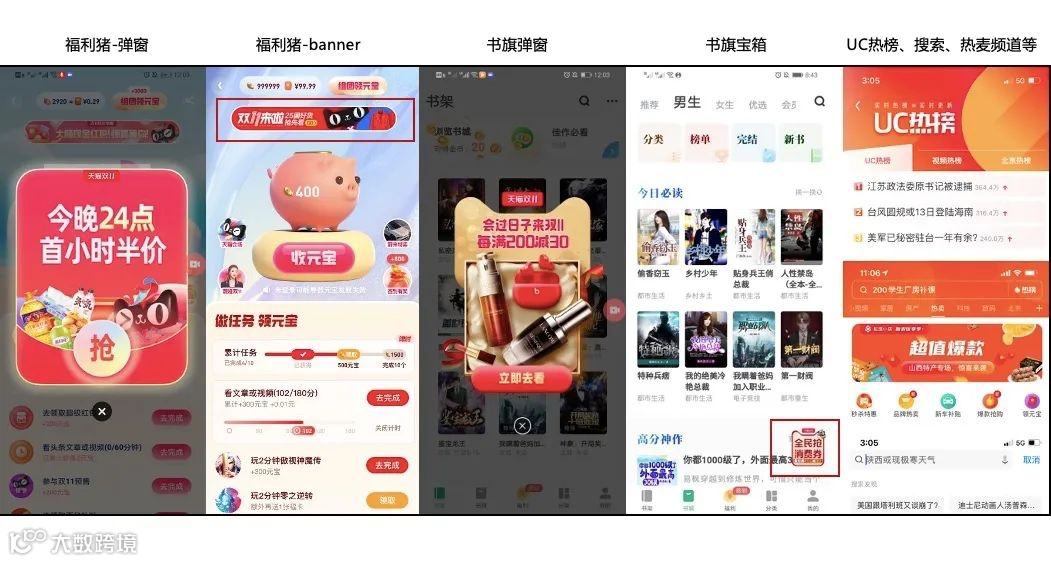 阿里智能信息事业群智能营销平台在今年双11配合天猫主站的活动节奏,将UC、书旗、夸克APP多端进行联动,打通多样化场景。期间累计上线数十个非标资源位,以大面积、多创意的弹窗设计抢占用户第一视线,营造节日氛围。同时结合多资源的组合拳,实现人群的全量覆盖。