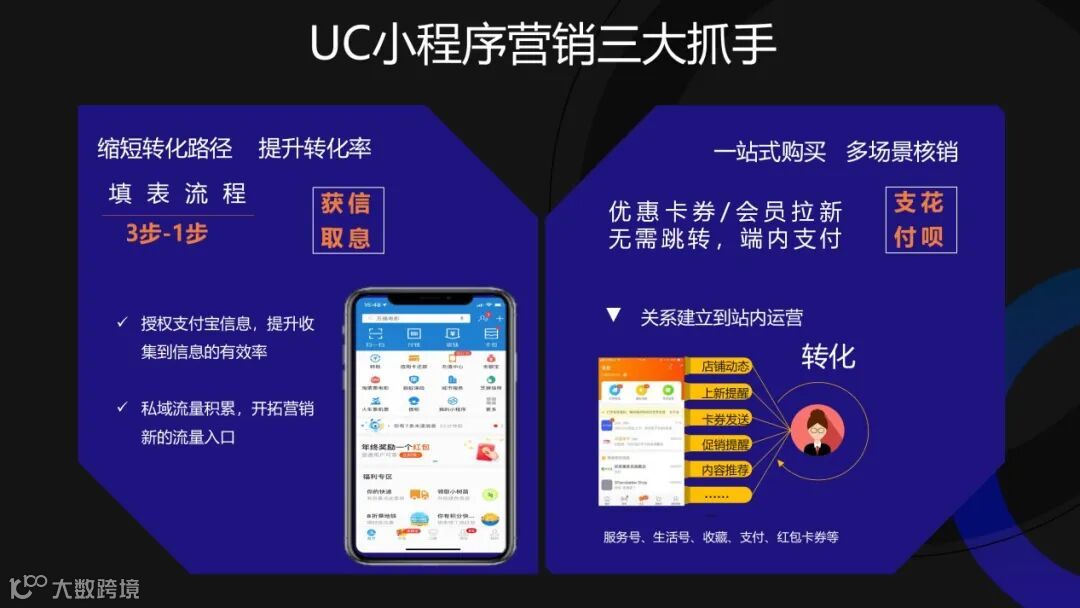 流量红利触顶的今天,如何从更多途径获取用户,是困扰每一位广告主的问题。UC与支付宝小程序的共建就是要帮助广告主开辟更多的流量入口,获得单一平台APP端以外的更多免费流量;而且不仅是触达,UC更是借助集团优势,利用三大营销抓手解决广告主获客难、留资难、转化难的三大难题,不仅让用户来,还要留下TA。
