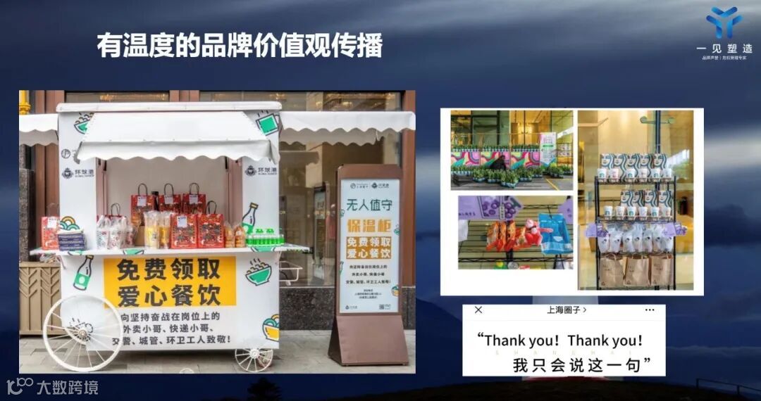 情感营销的时代,得人心者得天下,企业要做有温度的品牌,并打造与公众产生共情的人设。疫情期间我们看到上海的商场门口“爱心餐”,这是上海的环球港商城做的,让快递小哥、城管、环卫工人免费领取爱心餐饮,彰显了品牌的温度,产生强烈共情和情感共鸣。在这样的热点话题下,品牌也收获了很多忠实顾客的心, 实现价值双赢。