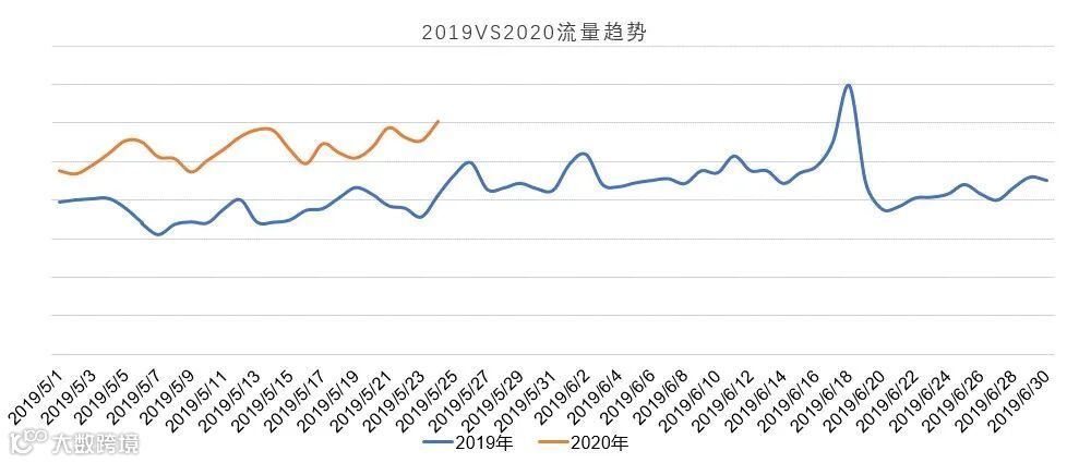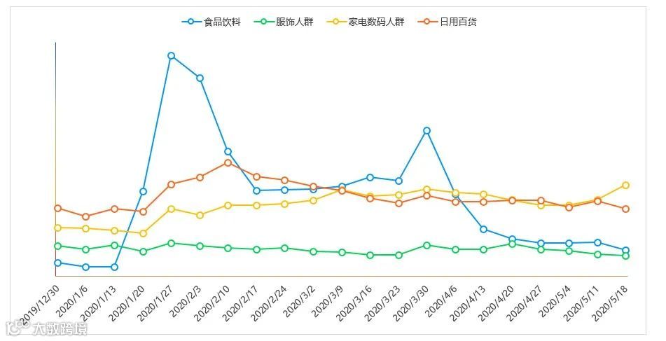 从趋势可以看出,疫情期间食品、日用百货类的流量增长达到峰值,随着国内疫情逐步控制,食品和日用百货的流量略有下降,但与疫情前相比,日常流量还是有一定的存量空间;服饰类流量则一直表现较为平稳,建议广告主维持常规投放即可。另外,5月之后,数码家电的流量有增长态势,对电商广告主来说,数码家电客单价高、人群更加精准,所以这部分人群依然会是今年618的兵家必争之地。