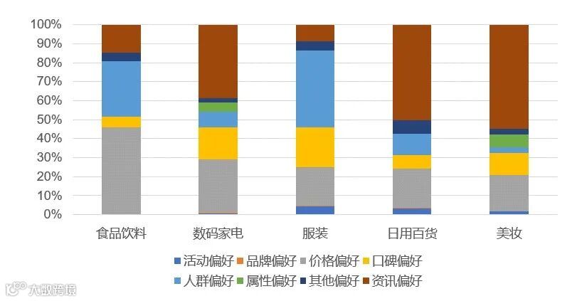 而根据用户的检索内容不同,我们可以看出,不同的品类中,用户关心的内容也有所不同,譬如日用百货和美妆用户,在信息需求上更偏向资讯类信息,而购买食品用户则关注价格优势,在实际投放中,广告主的创意可以针对用户不同的需求点进行调整。