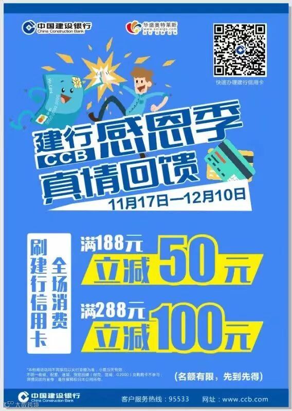 建行感恩季!即日起到南宁华南城华盛奥特莱斯购物刷建行信用卡满288元立减100元!
