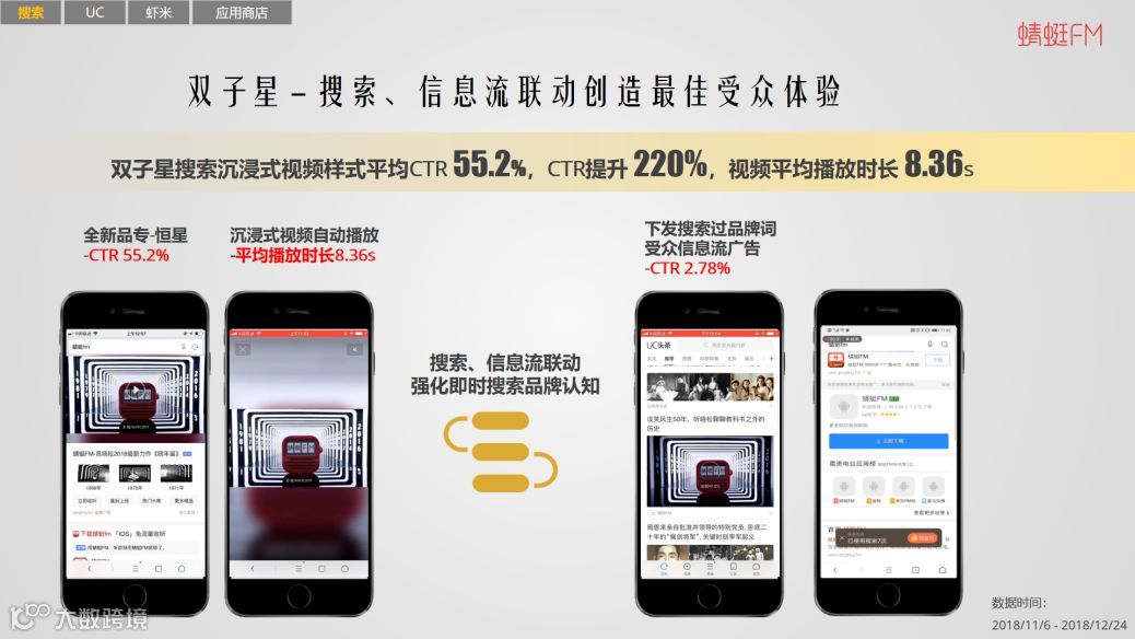 同时,运用“搜”+“推”即时再营销的广告产品——“双子星”进行投放,在UC端进行了搜索与信息流的全链曝光,有效时间内完成针对核心用户的跨场景多频沟通,不仅实现精准触达,双子星搜索沉浸式视频样式CTR更是提升220%,全面提升IP影响力。