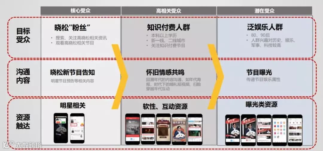 在《晓年鉴》推广过程中,蜻蜓FM突破了以往的的营销经验,率先尝试了与阿里文娱智能营销平台全新合作投放模式。在大数据趋势洞察及决策分析平台——牵星系统的助力下,精准锁定三类目标人群——核心受众、高相关受众、潜在受众,并定位了营销在神马搜索、UC、虾米音乐、应用商店四种场景的联合推广,实现多场景资源全链打通。