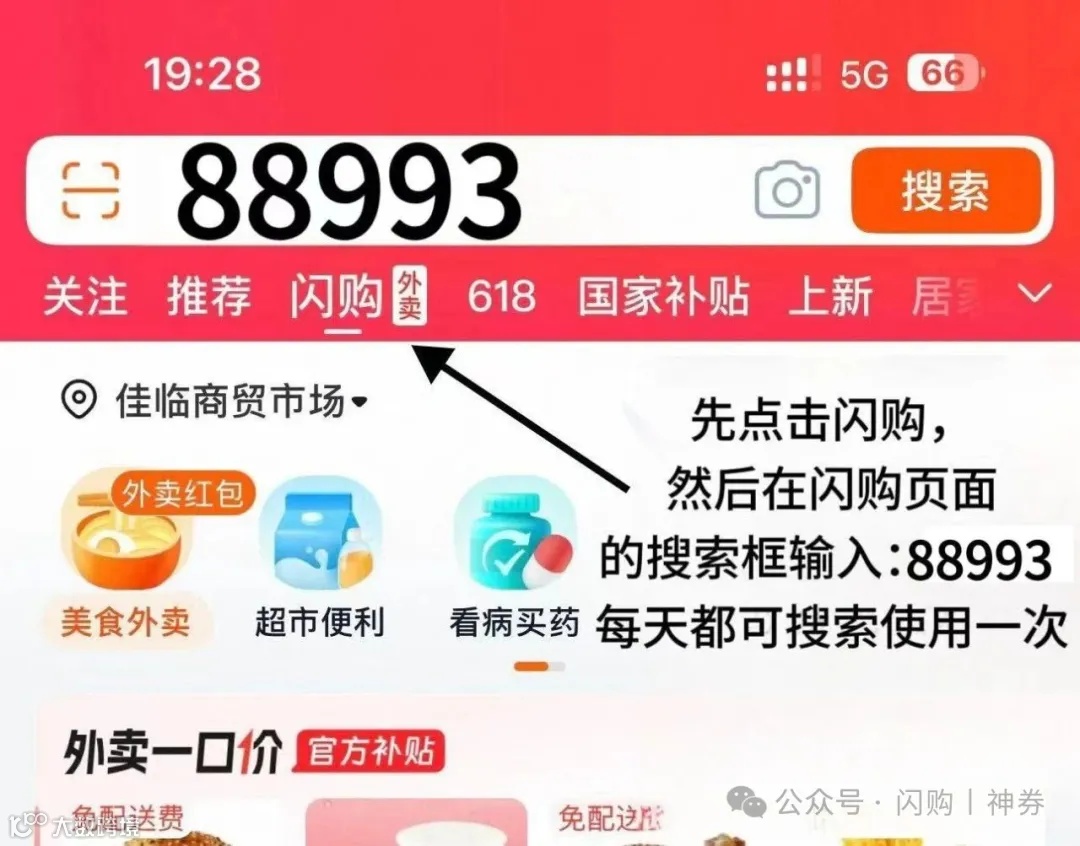 如下图,要在闪购的搜索框输入88993   活动为长期活动,记得保存本数字口令每天可以领取!该口令会保存在闪购的“历史搜索”中,后续每天可使用,如果领不到说明领的太多了,需要换号领)