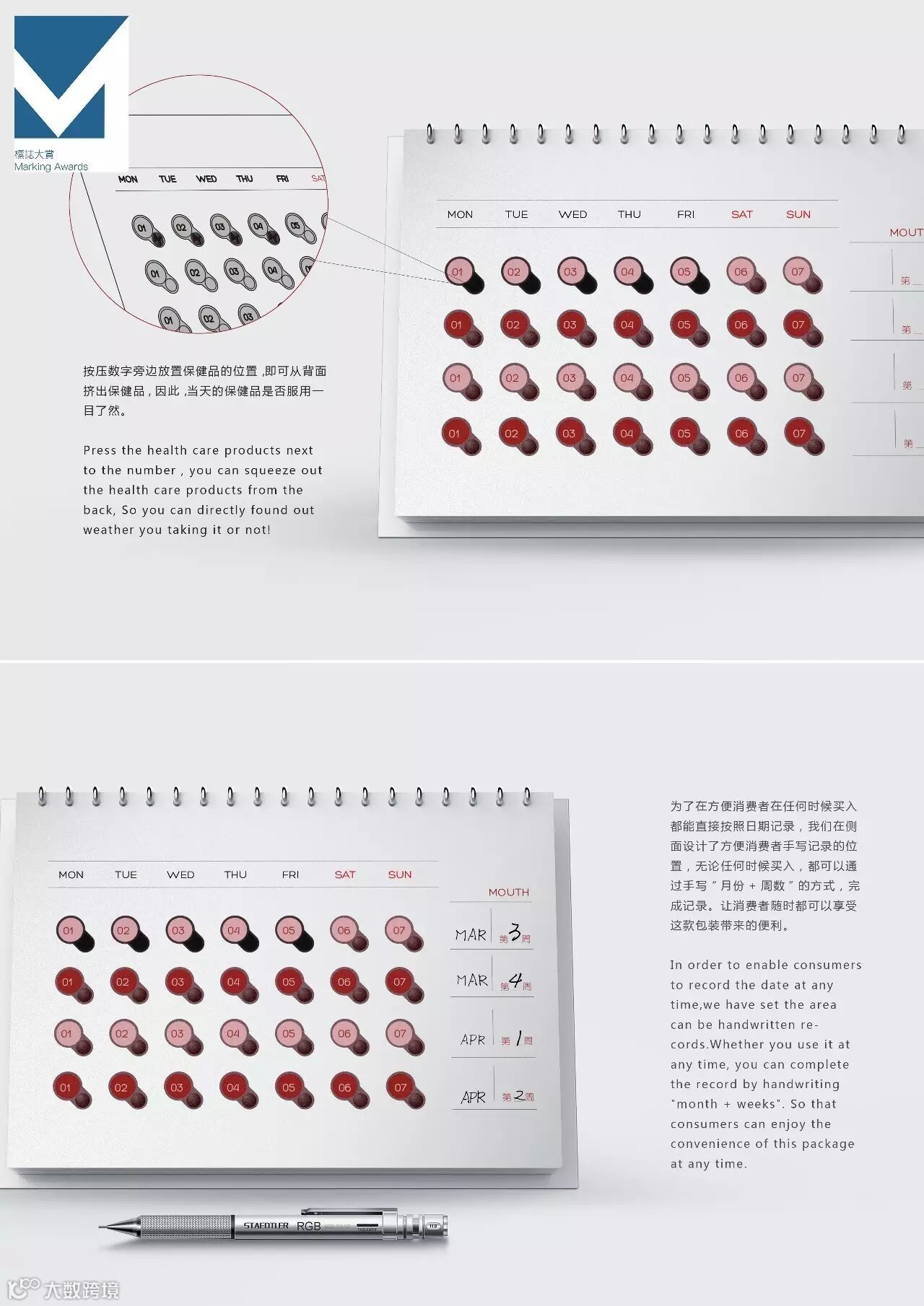 现代人由于工作生活压力较大,亚健康人群越来越多。需要服用保健品进行日常保健的人也越来越多,大多数保健品都是按天按时服用的,这样才能起到保健效果,但由于较快的工作生活节奏,人们通常会忘记是否服用过保健品。因此提醒自己或家人按时服用保健品,就变成了一个非常重要的事情,我们创新性的将药品包装和日历进行了结合,每到一天,就需要吃掉对应当天日期下面的保健品,这样的设计的好处就是,有没有按时服用保健品就一目了然,方便提醒消费者,让他们能够按时按量的服用保健品。