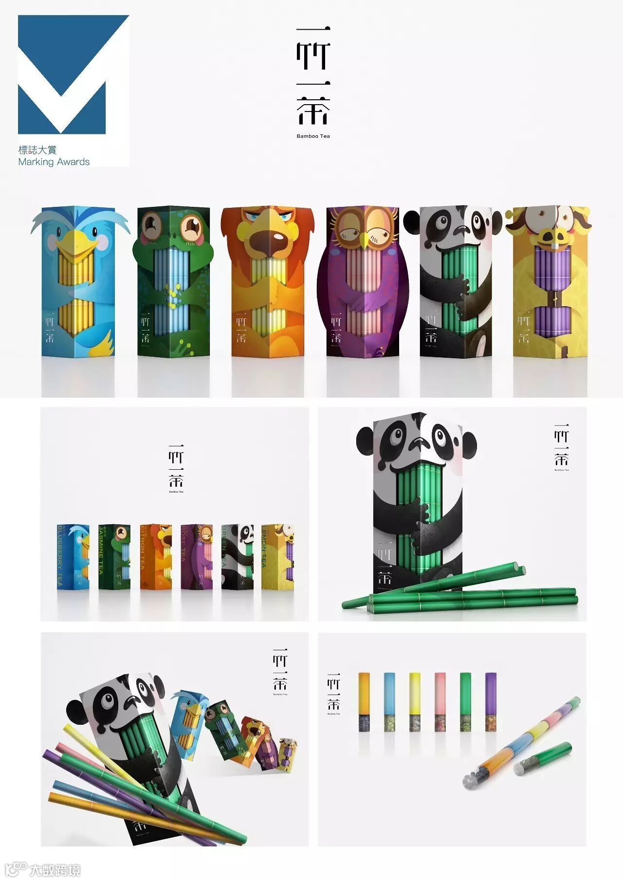 一竹一茶(BambooTea)是一款创意趣味吸管茶,其独特在于只需将吸管插入温水中就可以吸出茶水。六款茶叶口味,可自由搭配,吸管的设计采用竹节的形态,每一节都可以根据自己选择的口味自由拼接。吸管方便携带,适合于生活繁忙的却爱茶的年轻人群。茶能提神、明目、助消化,使得很多人的生活离不开茶,尤其是对于上班族。“一竹一茶”一共六款包装设计,外包装选取动物形态,以“熊猫抱竹子”为主打形象,延伸出另外五款动物设计。包装的设计充满趣味性,设计师将动物与竹子最完美的结合,给人以与众不同的感觉。让客户体验超越视觉上的愉悦,使得包装形象成为品牌的核心资产,视觉化传播并与消费者互动。设计打破了传统的喝茶方式,创造更多酷炫新喝法,这支茶吸管通过巧妙的的滤嘴结构,让茶在吸管里,吸食温水时,吸管里的茶会即速融入水中,喝到嘴中会有各种不同的茶香味,让喝茶变得方便且趣味,人人爱上喝茶。不同的茶会有不同的功效,可根据自己需求搭配不同的种类,有玫瑰花茶、柠檬茶、绿茶、柚子茶、茉莉花茶、蓝莓茶,可以任意拼接调配自己的口味。