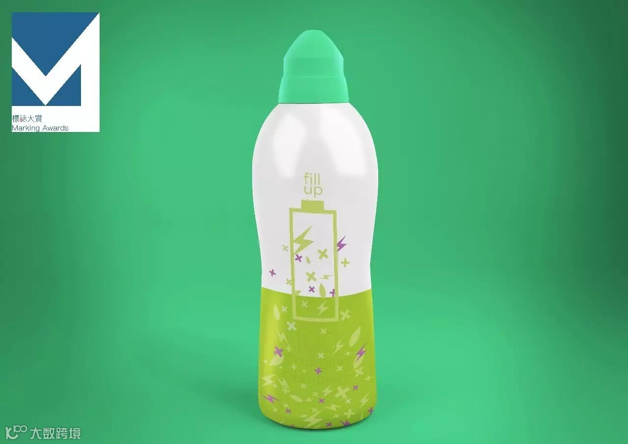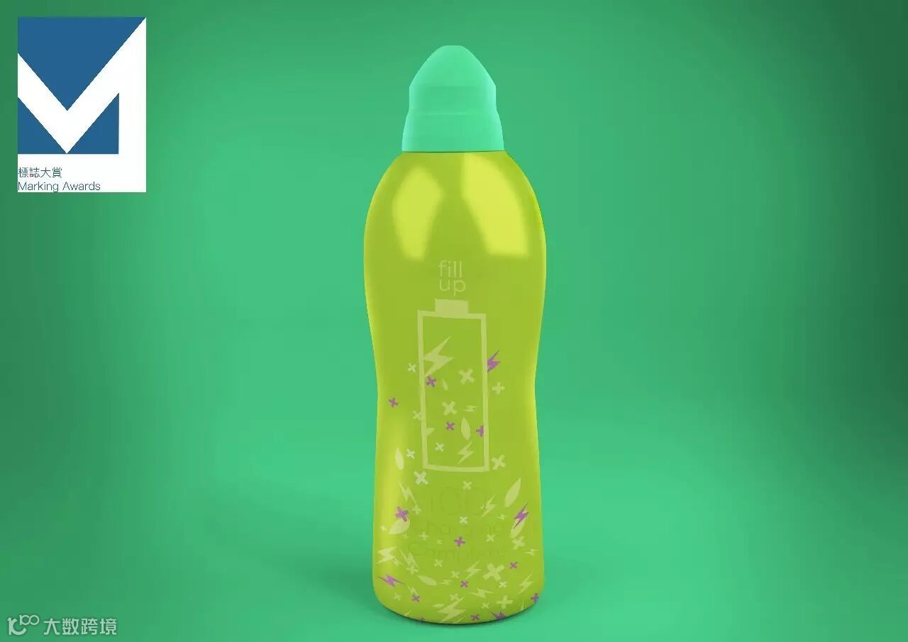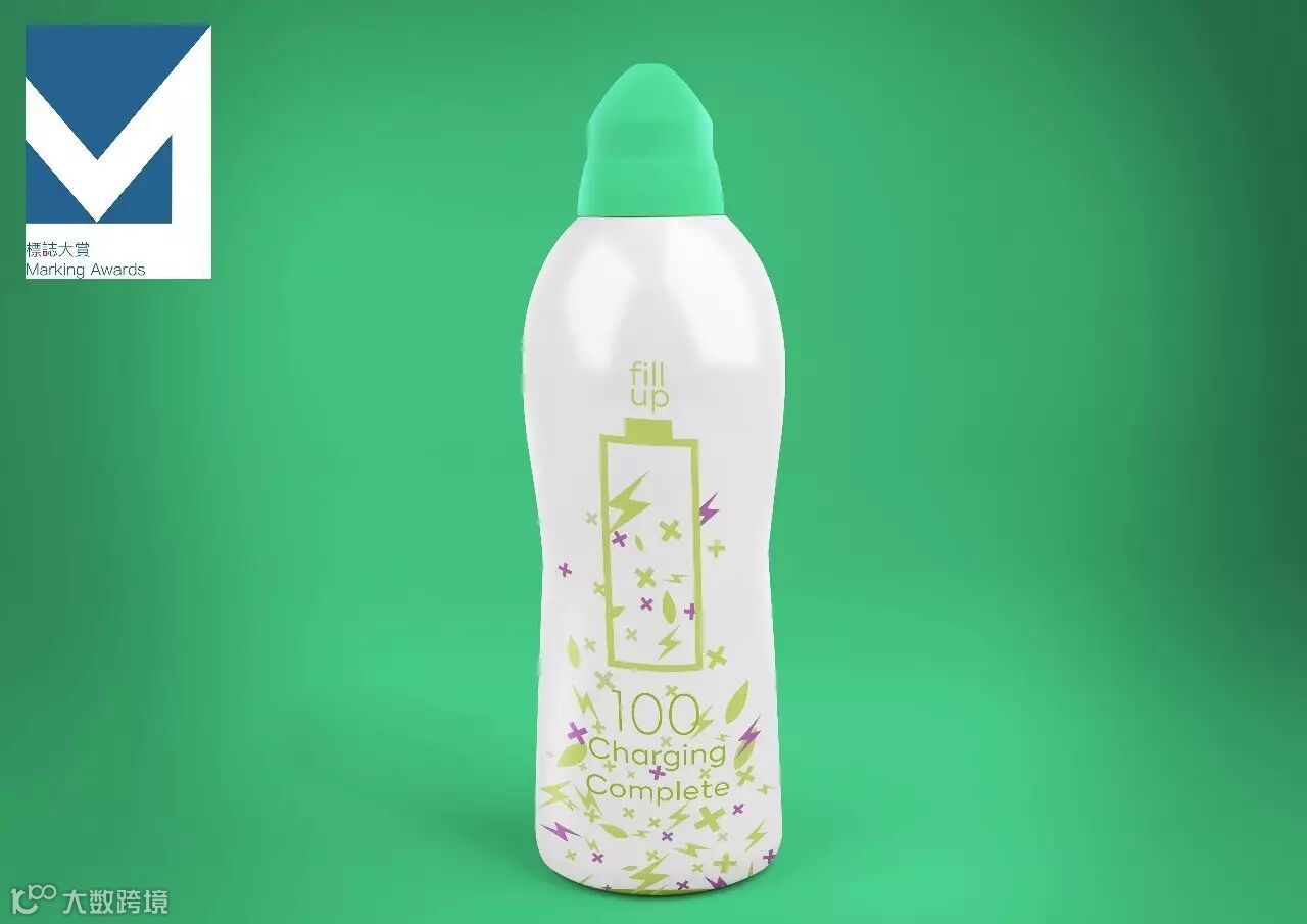 绿色的包装不仅体现了产品的自然绿色的特点而且也在琳琅满目的货架中脱颖而出。特色的电池图案会随着饮料的从满到空演示一个充电的过程。饮用后会出现“充电完成”的标语给饮用者力量。瓶身方便抓握。