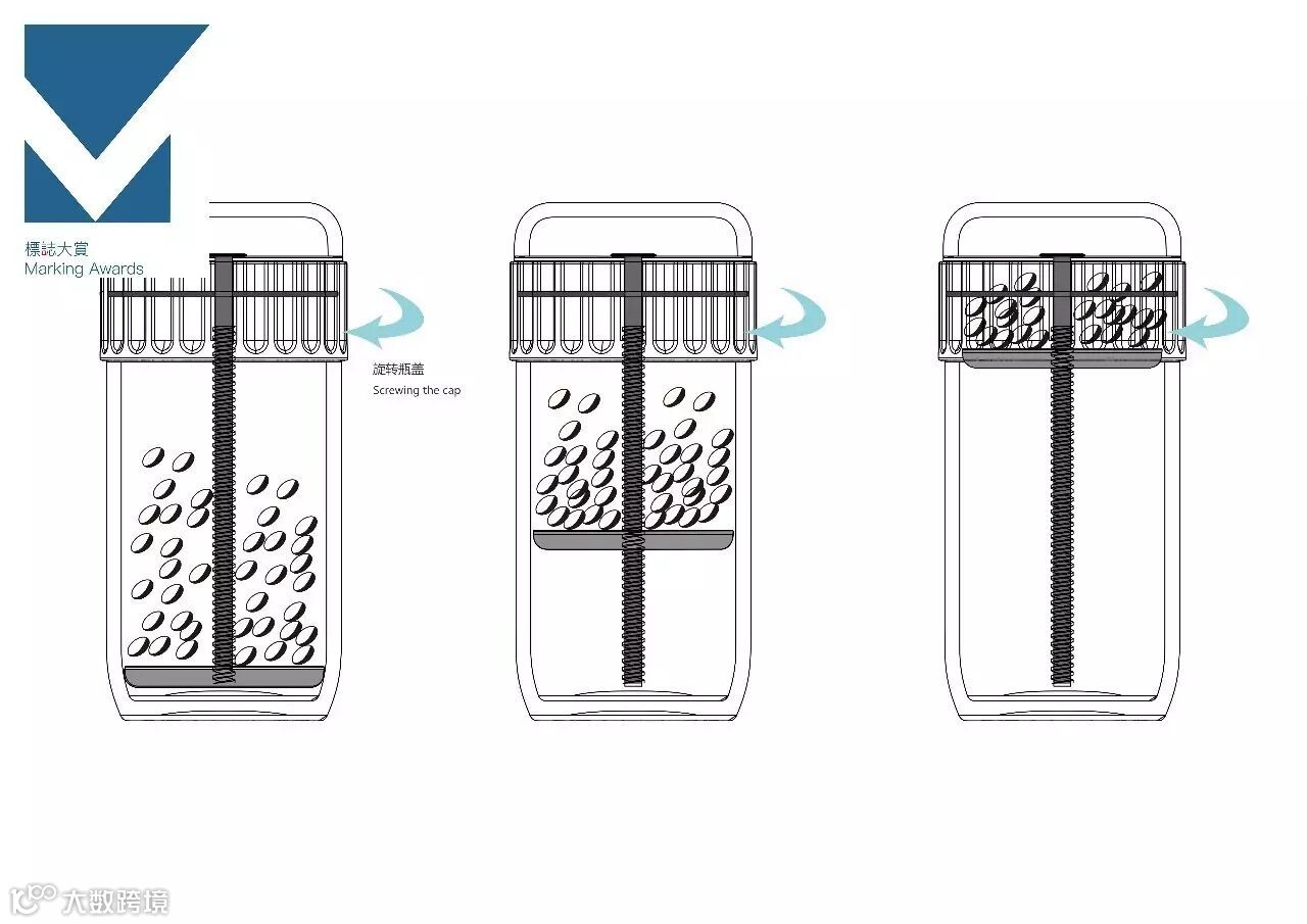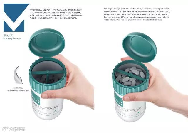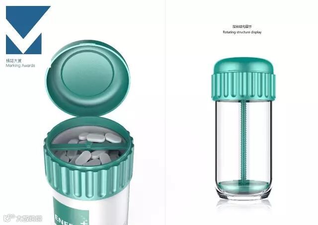 传统的丸剂或胶囊保健品包装,都是采用旋盖或者翻盖的结构,打开盖子之后,再把丸剂或胶囊倒在手上服用,这个过程中,存在着很多问题,首先,我们经常出现一次本来想取一颗丸剂或胶囊,结果不一小心倒出好多颗,还需要再次装入瓶中,这个过程极有可能让原来瓶中的丸剂或胶囊沾染细菌。另外,当我们将这种包装的丸剂或胶囊放入包中,外出携带时,就会出现一种尴尬的情况,就是药片会在瓶中来回晃动,发出声响,给消费者带来困扰。我们设计了一种全新的包装结构,在瓶中增加了一个旋转上升的空间,当需要服用丸剂或胶囊时,旋转瓶盖位置,即可将装药片的空间向上提升,这样无论瓶内还有多少丸剂或胶囊,都可以从顶部直接拿取,方便又卫生。同时装丸剂或胶囊的空间向上抬起,压缩瓶体内空间,无论还剩多少丸剂或胶囊,都可以将它们压缩在一个空间,防止丸剂或胶囊来回晃动。