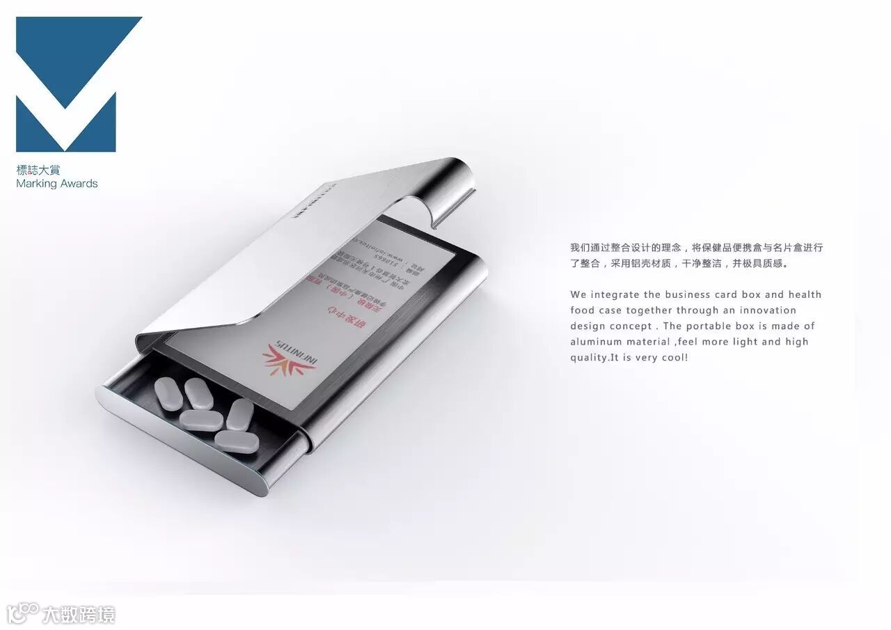 现代社会高端商务办公人群越来越注重身体的健康,当外出的时候需要携带保健品,或身体不适时需携带药品的时候,经常会因为没有地方放置而烦恼,如果随身携带,又需要考虑携带的方便性,舒适性等因素,因此,对于商务办公人群,如何优雅的携带保健品或药品是一个问题。且对于高端商务人士来说,所携带保健品专用盒需要和其身份地位相匹配。我们通过整合设计的理念,将药盒与名片盒进行了整合,采用铝壳材质,干净整洁,并极具质感,消除了药盒给人的不适感。