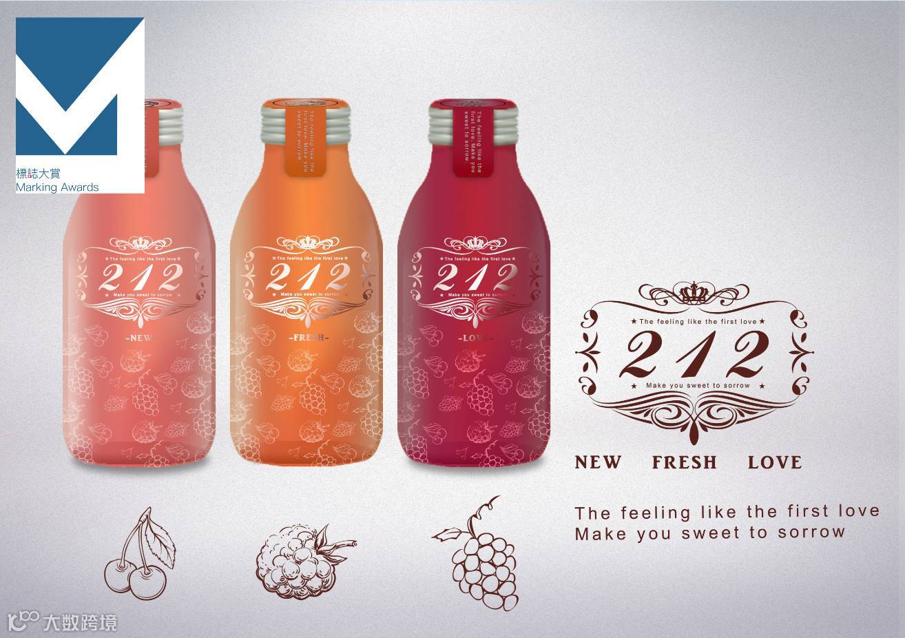 “设计灵感来源于初恋,212源自初恋的生日是2.12。爱情是毒药,因此选择像药瓶一样的容器。我愿你永远是我的公主(王子),因此品牌标志设计为皇冠。三种口味的鸡尾酒,代表恋爱的三个阶段,樱桃代表相遇,桑葚代表相恋,葡萄代表热恋,初恋每个阶段都是甜蜜的,但是别忘了爱情是毒药,最后总会让人忧伤。一口皇冠212,满满都是初恋的味道,让你甜到忧伤。三种口味有不同程度甜味,让你回忆初恋,回忆青涩的年华。”