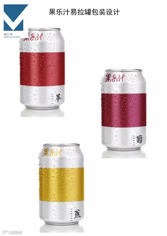 本产品是一款果汁,采用易拉罐的包装方式,设计简约,大量留白。易拉罐中部彩带的颜色代表着不同水果的颜色,从顶部产品字体的颜色也可以看出该点。底部的汉字和英文组合简洁,清晰。