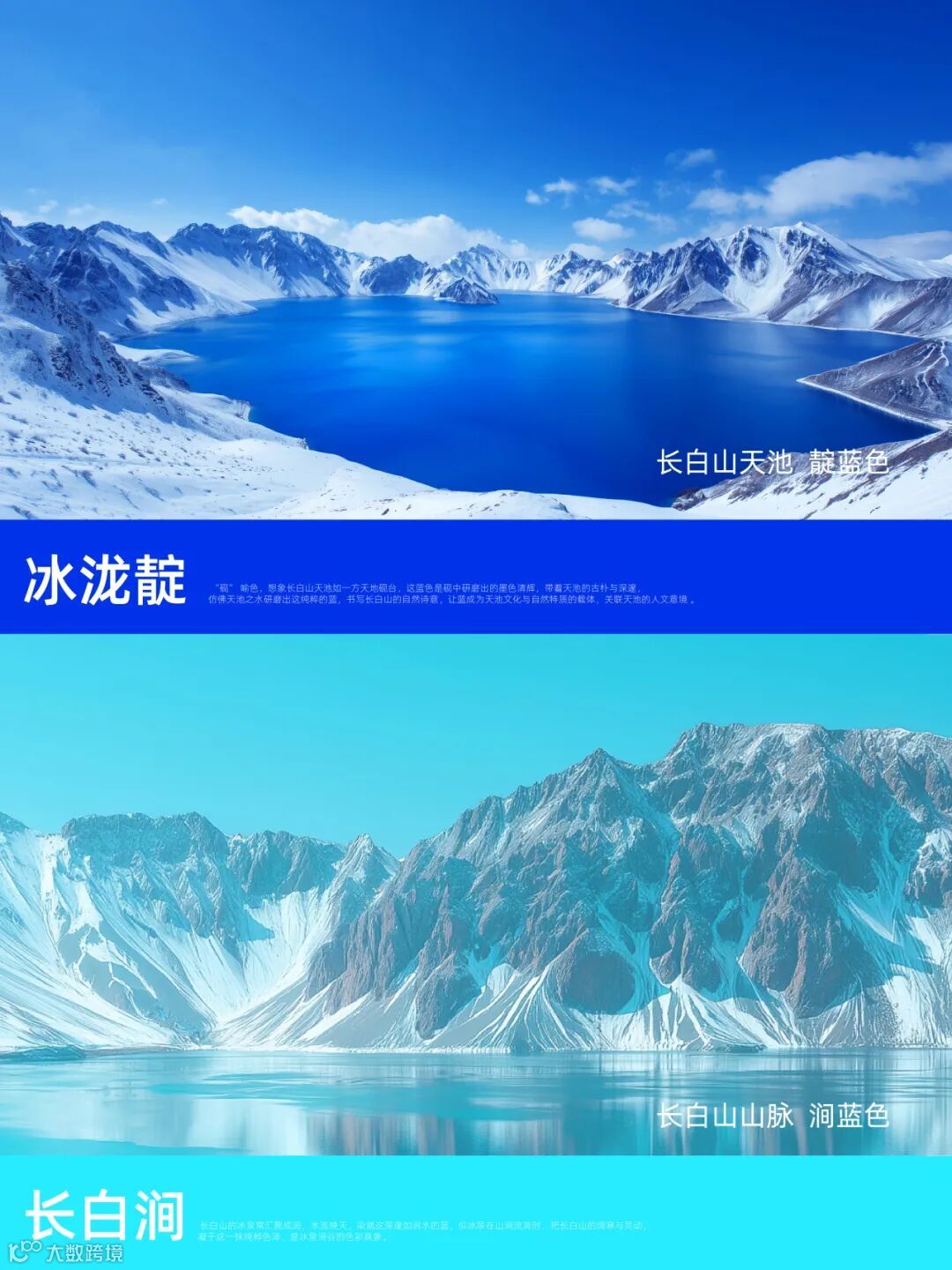 上部的层叠山形,以简洁的曲线复刻长白山的巍峨轮廓,每一道起伏都藏着天池的云影、山风的呼吸;下部的 “∞” 形水韵 ,既是泉水灵动的姿态,又暗合 “无限滋养、永恒发展” 的品牌初心。蓝白主色调取自长白山的灵魂 —— 天池 “冰泷靛” 的深邃、山脉 “长白涧” 的清透,让 LOGO 成为长白山山水的微缩标本。