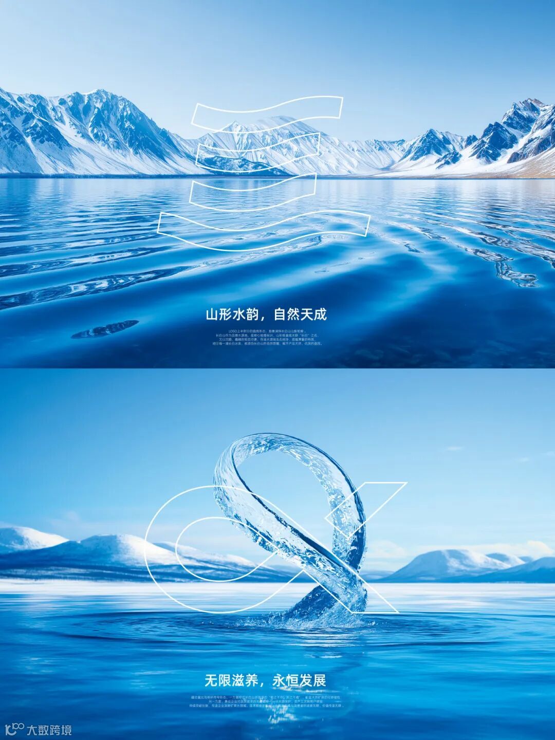 战略级包装的视觉转化,把长白山 “装” 进瓶里。从策略到创意:符号化长白山。为了将 “长白山美学” 具象化,我们创造了两大核心视觉符号:山形纹:提炼长白山主峰的层叠轮廓,将 “山” 的巍峨与厚重转化为 LOGO 的上部结构;水韵纹:以 “∞” 形呈现泉水的灵动与循环,既象征水源的永续,又暗合 “无限滋养” 的品牌价值。
