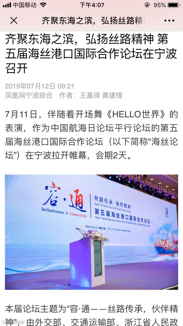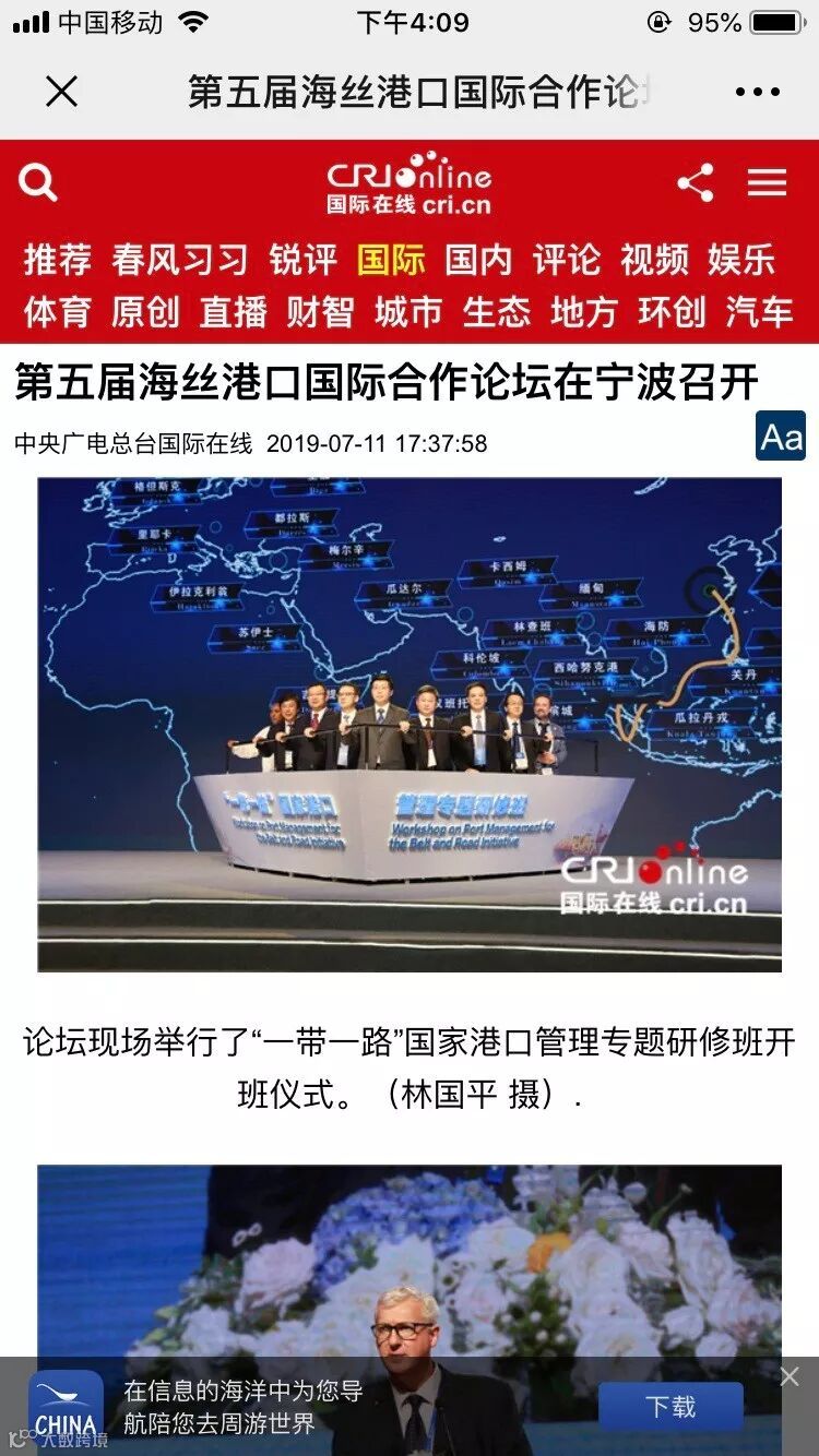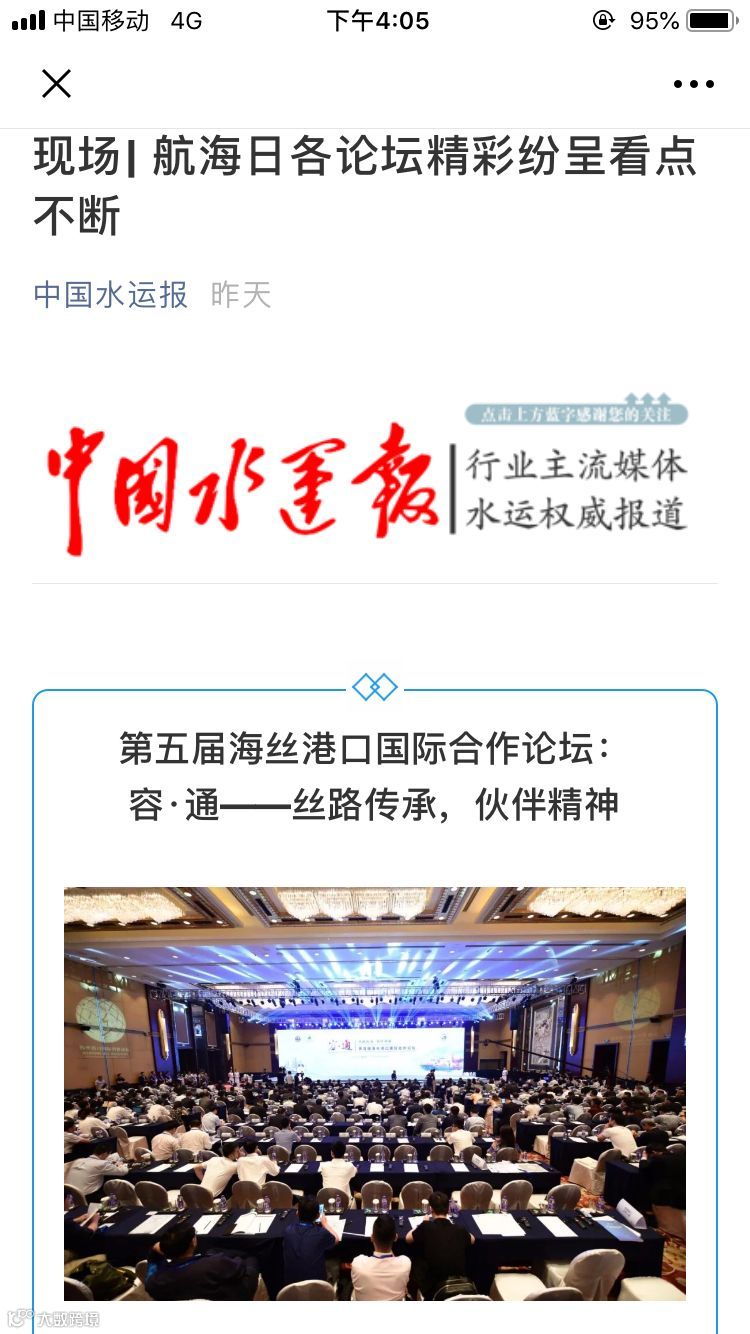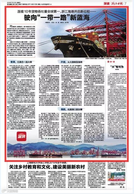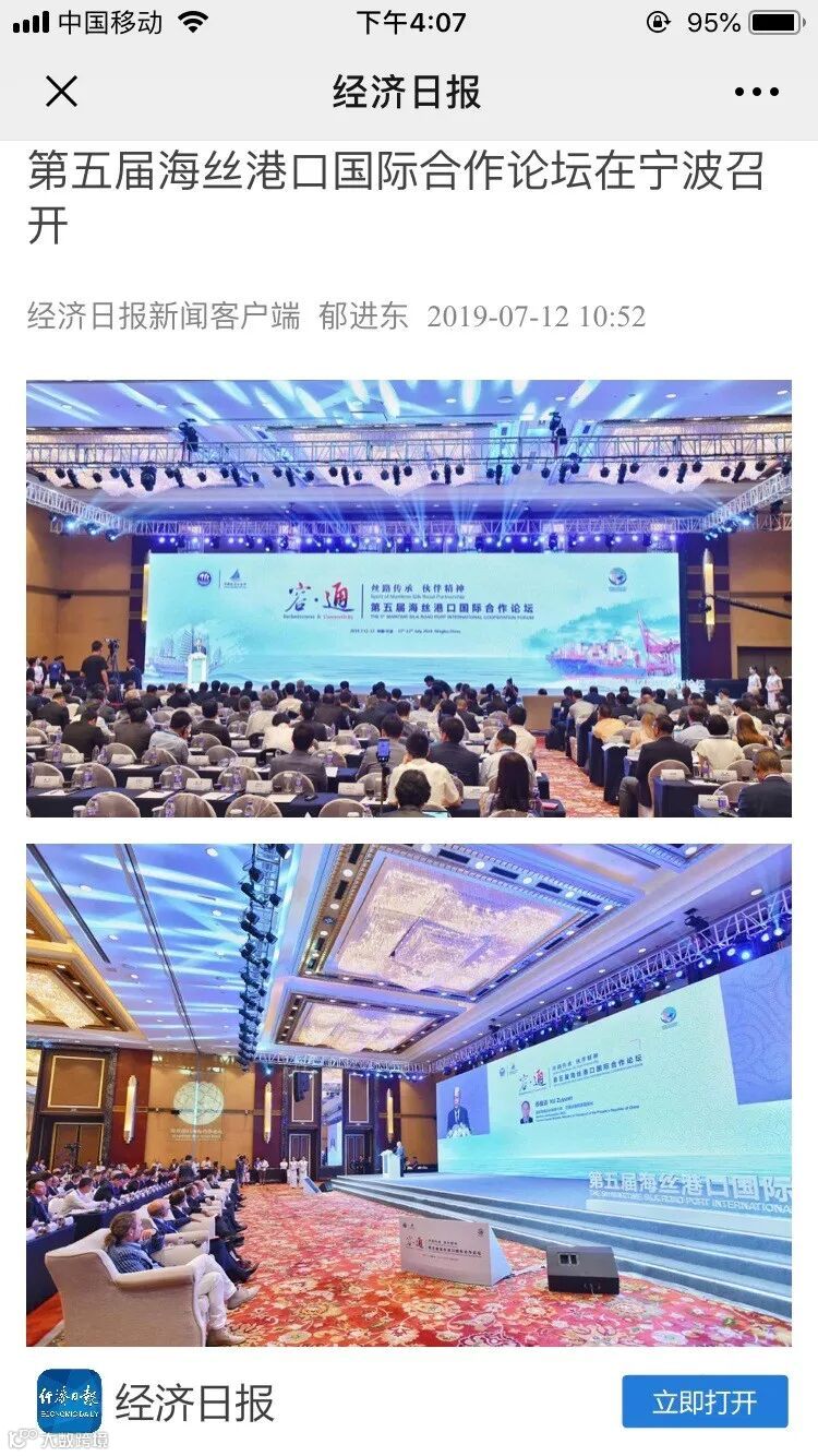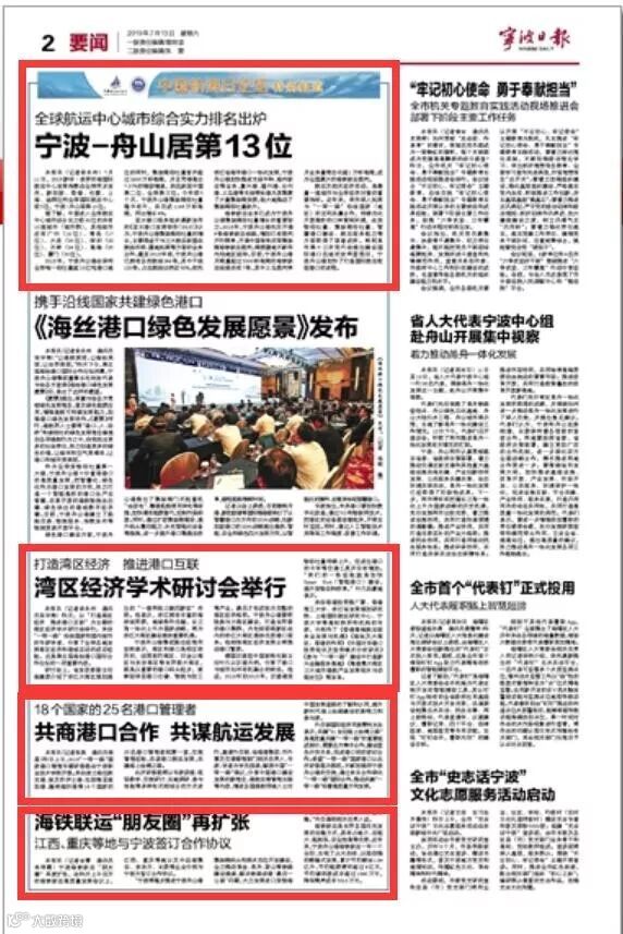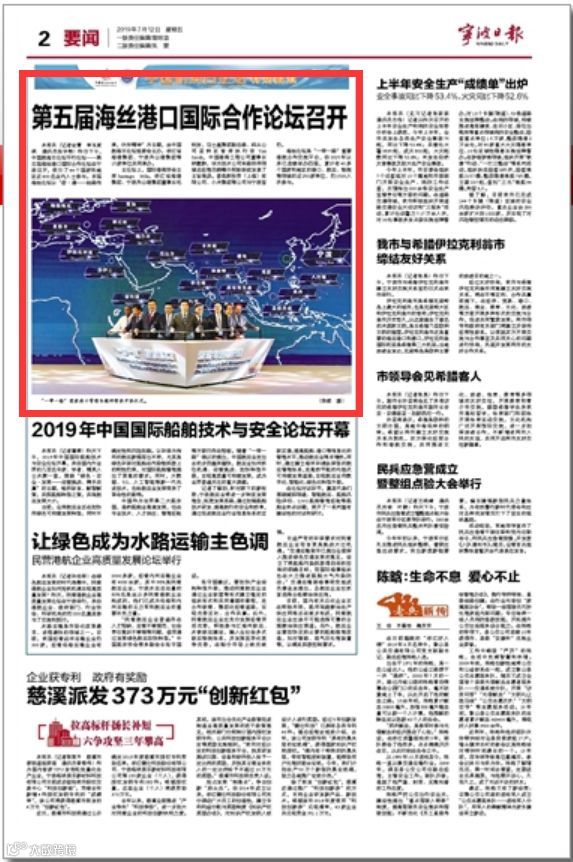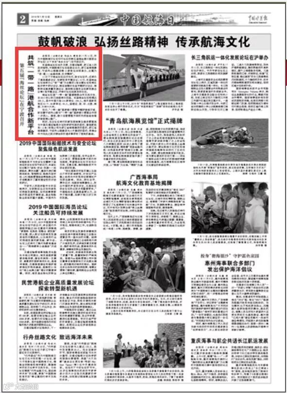 7月11日至12日,中国航海日论坛平行论坛——第五届海丝港口国际合作论坛在宁波成功举行。论坛举行期间及其前后,中央电视台、新华社、人民网、央广等央级主流媒体,中国交通报、中国水运报等行业主流媒体以及省市主流媒体、香港媒体以各种形式,对论坛和集团进行了立体、滚动、集中报道,提升了论坛和集团的知名度、美誉度和影响力。