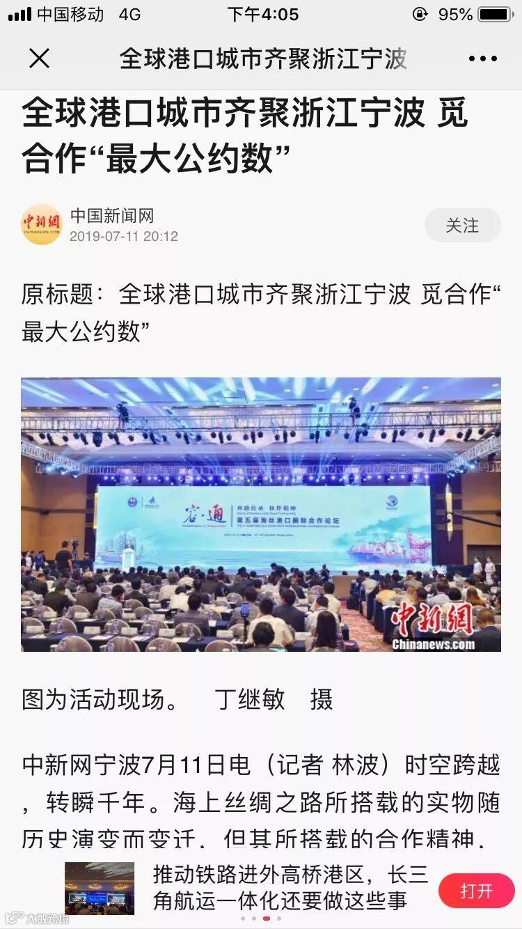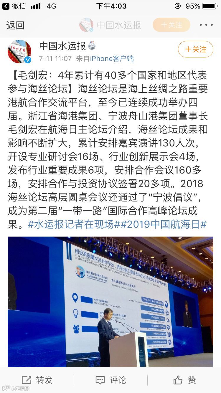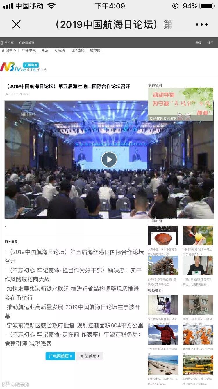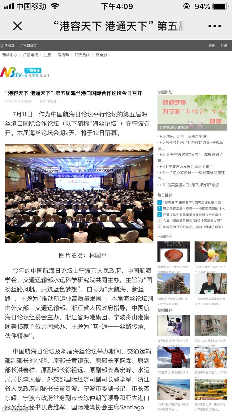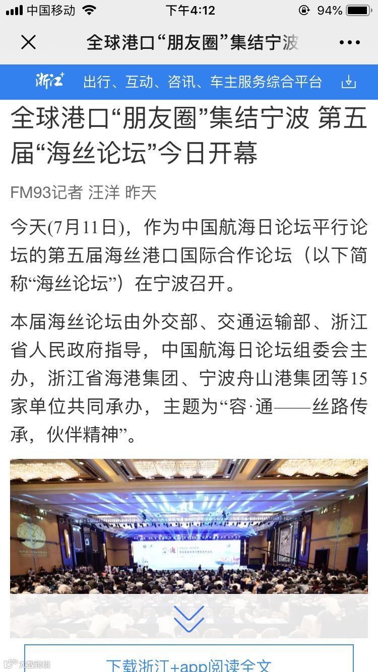 7月11日至12日,中国航海日论坛平行论坛——第五届海丝港口国际合作论坛在宁波成功举行。论坛举行期间及其前后,中央电视台、新华社、人民网、央广等央级主流媒体,中国交通报、中国水运报等行业主流媒体以及省市主流媒体、香港媒体以各种形式,对论坛和集团进行了立体、滚动、集中报道,提升了论坛和集团的知名度、美誉度和影响力。