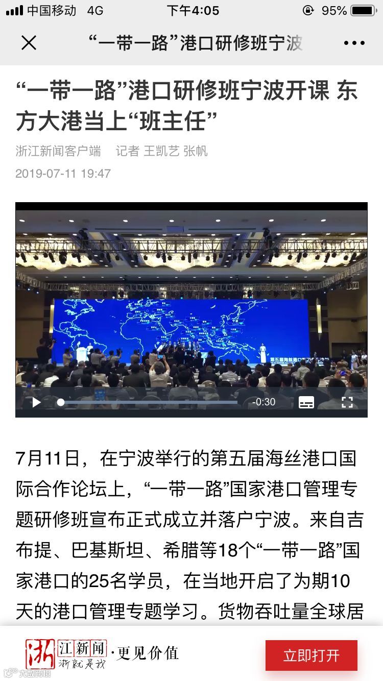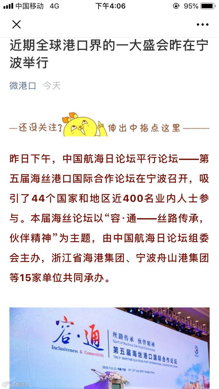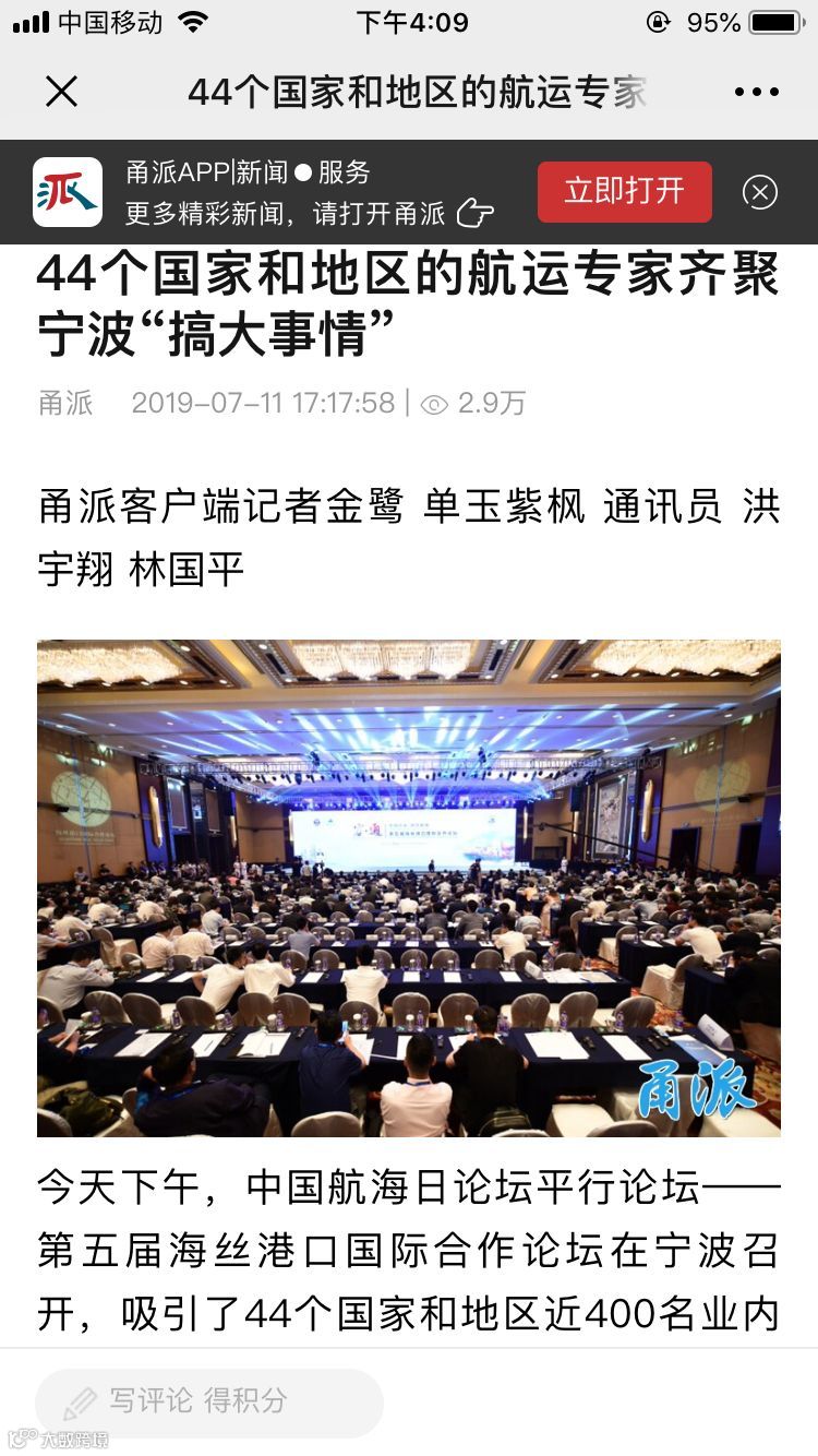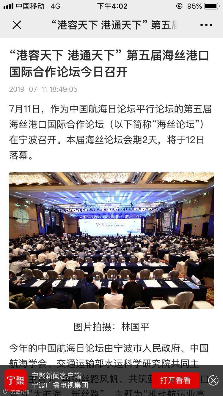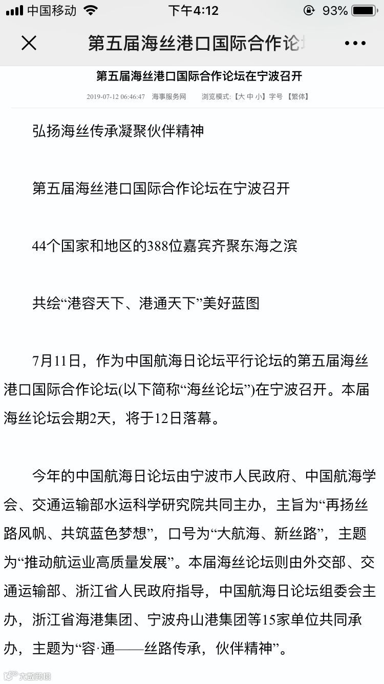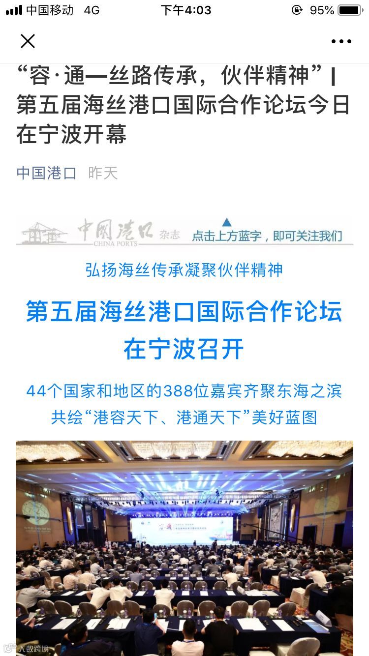 7月11日至12日,中国航海日论坛平行论坛——第五届海丝港口国际合作论坛在宁波成功举行。论坛举行期间及其前后,中央电视台、新华社、人民网、央广等央级主流媒体,中国交通报、中国水运报等行业主流媒体以及省市主流媒体、香港媒体以各种形式,对论坛和集团进行了立体、滚动、集中报道,提升了论坛和集团的知名度、美誉度和影响力。
