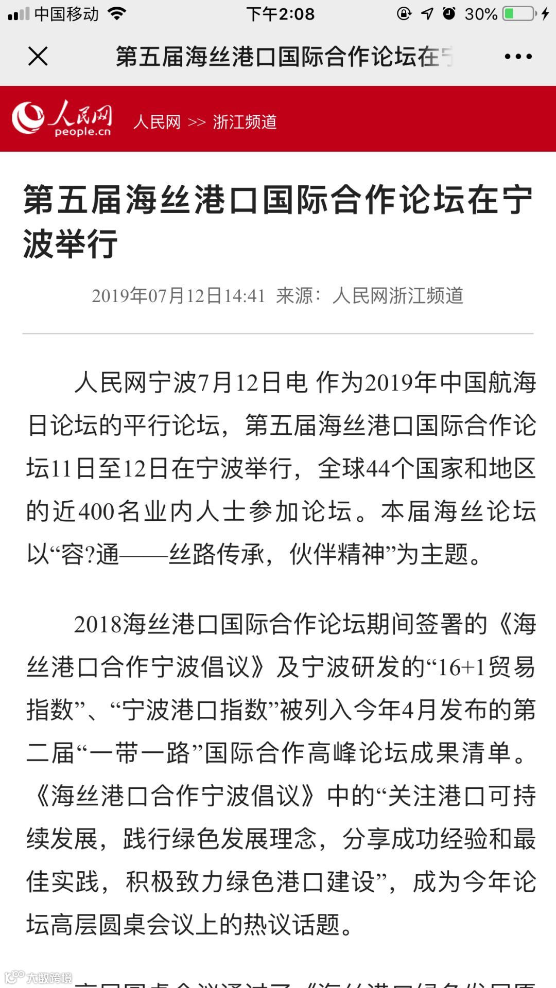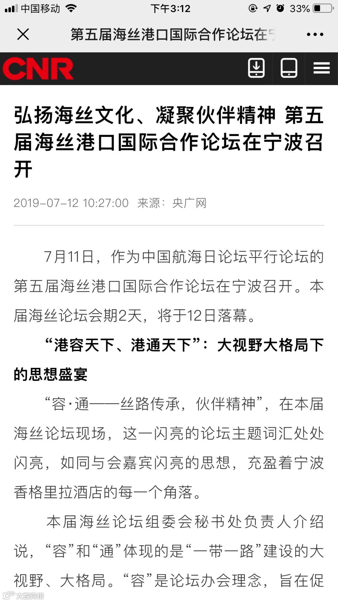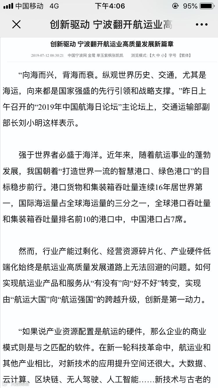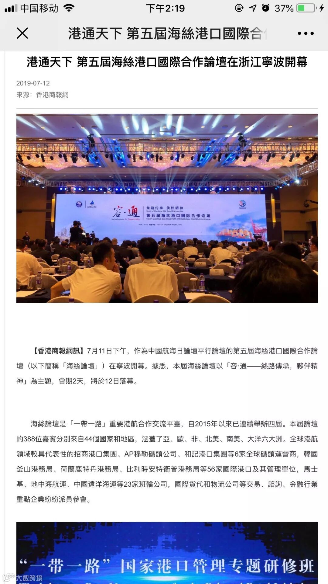 7月11日至12日,中国航海日论坛平行论坛——第五届海丝港口国际合作论坛在宁波成功举行。论坛举行期间及其前后,中央电视台、新华社、人民网、央广等央级主流媒体,中国交通报、中国水运报等行业主流媒体以及省市主流媒体、香港媒体以各种形式,对论坛和集团进行了立体、滚动、集中报道,提升了论坛和集团的知名度、美誉度和影响力。