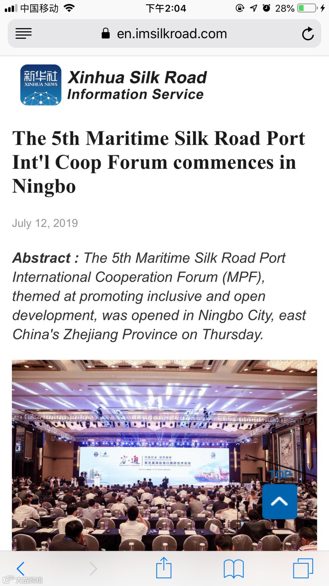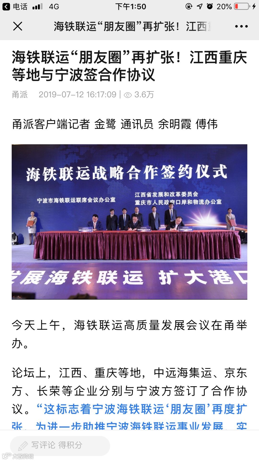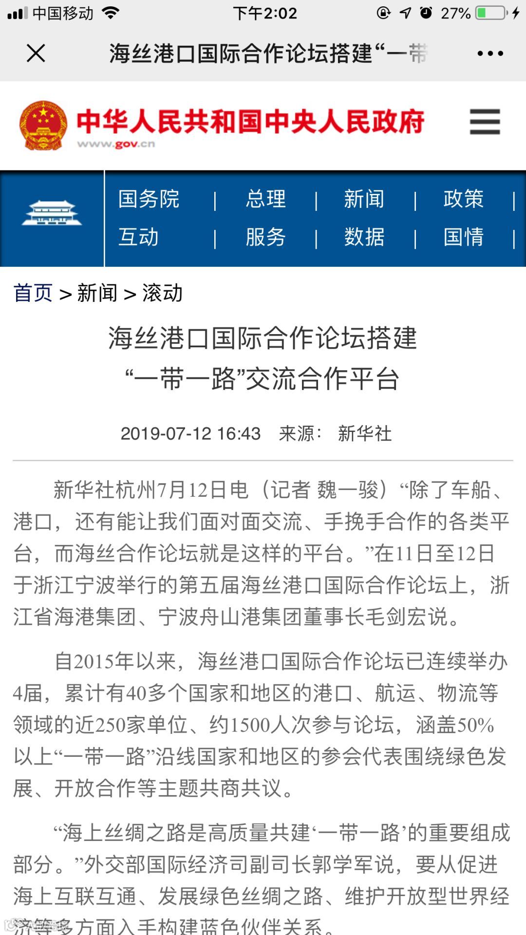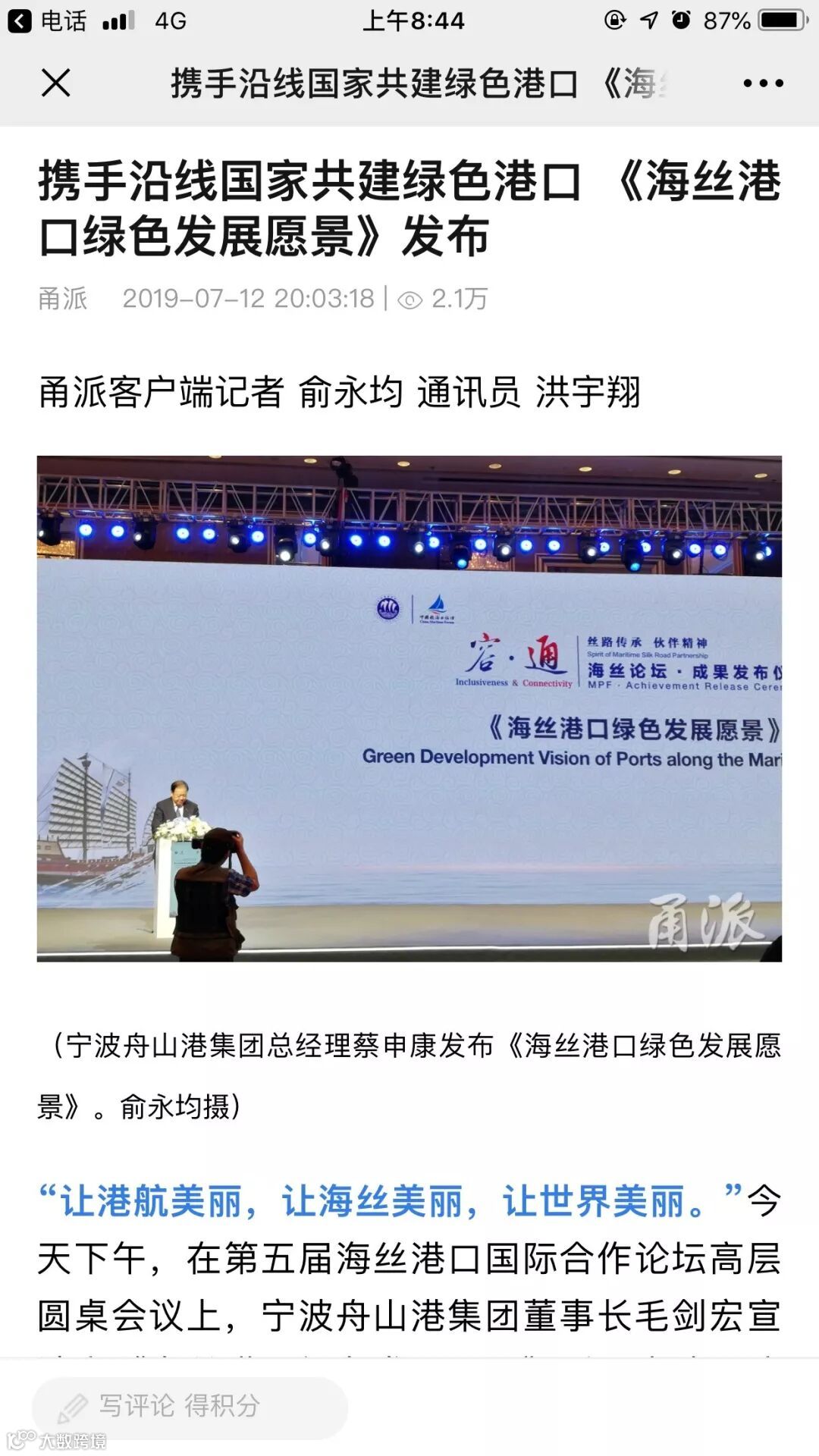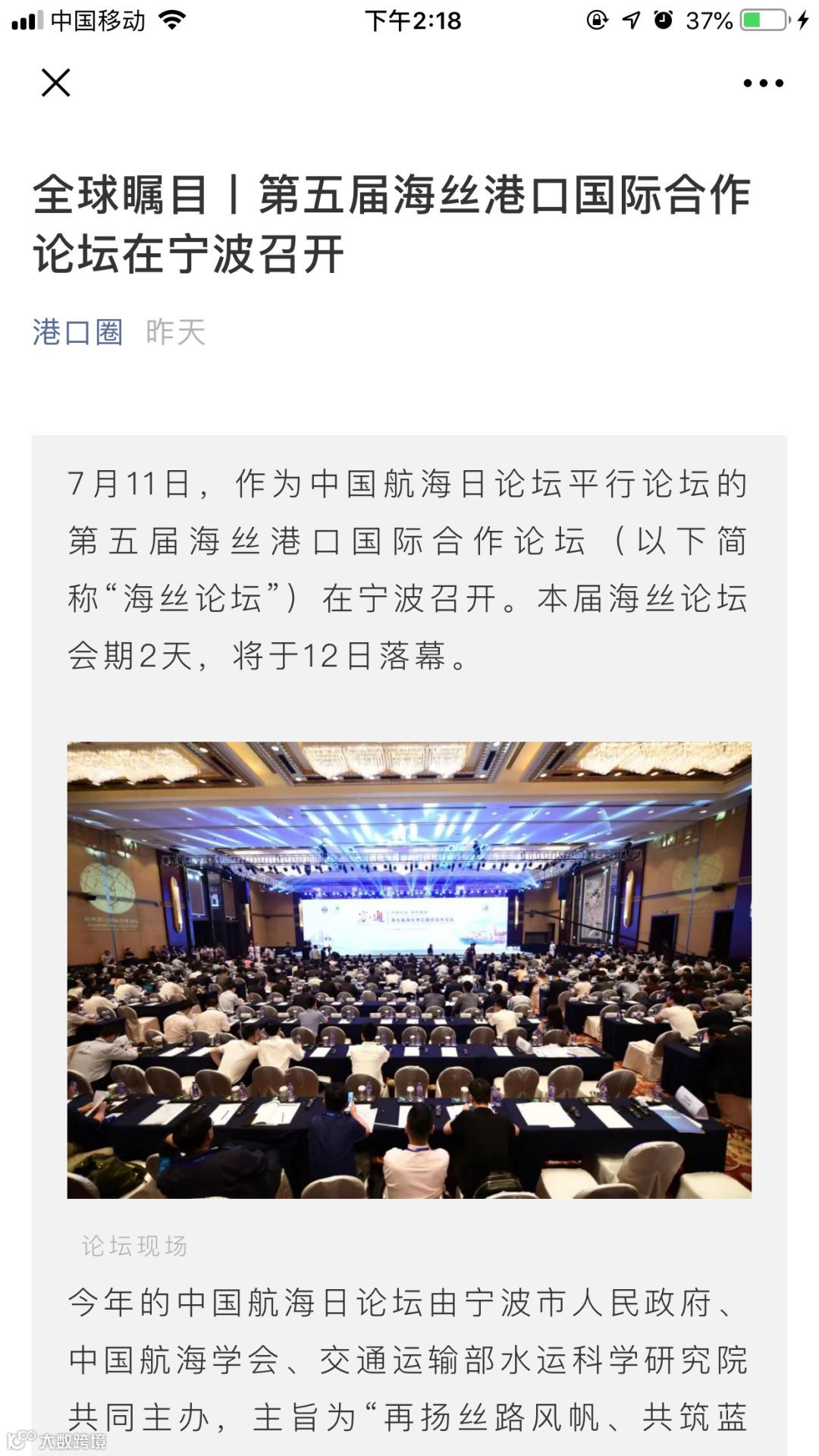 7月11日至12日,中国航海日论坛平行论坛——第五届海丝港口国际合作论坛在宁波成功举行。论坛举行期间及其前后,中央电视台、新华社、人民网、央广等央级主流媒体,中国交通报、中国水运报等行业主流媒体以及省市主流媒体、香港媒体以各种形式,对论坛和集团进行了立体、滚动、集中报道,提升了论坛和集团的知名度、美誉度和影响力。