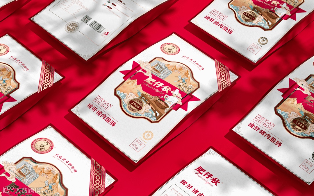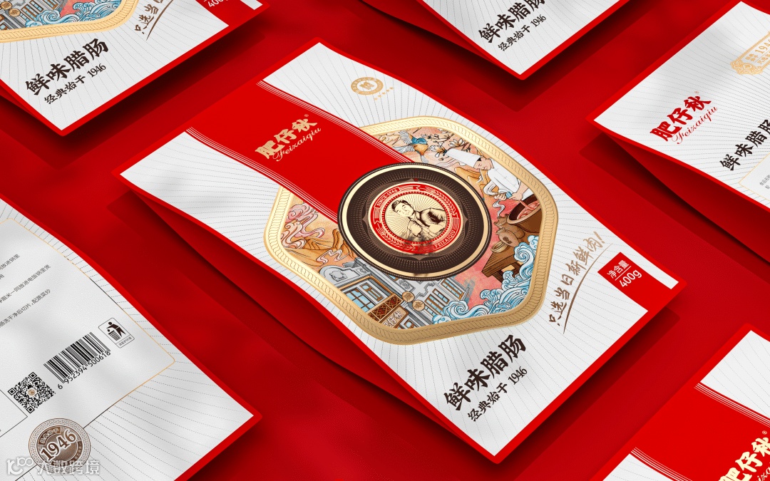香味是唤起食客味觉记忆的开关。香味又如何在包装中体现?在美香腊肠和生晒香肠的设计中,设计师使用的花瓣+漏窗的造型,花瓣暗示味道,漏窗中蒸腊肠的白烟溢出漏窗,唤起儿时放学路上,家中饭菜香气的记忆。