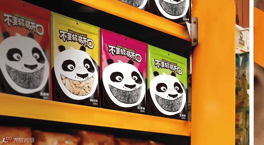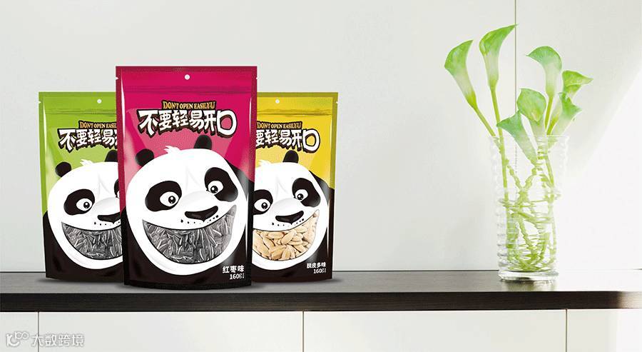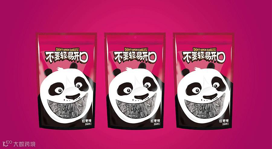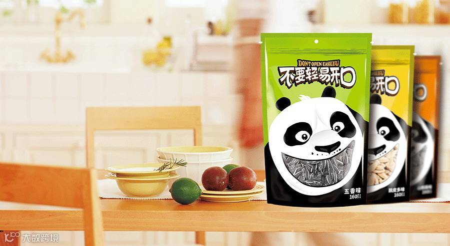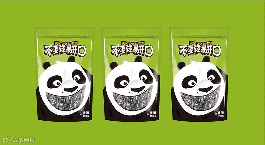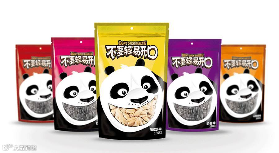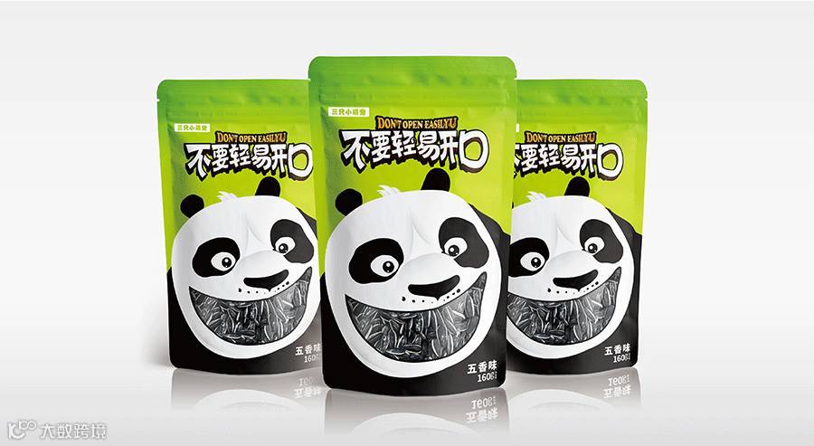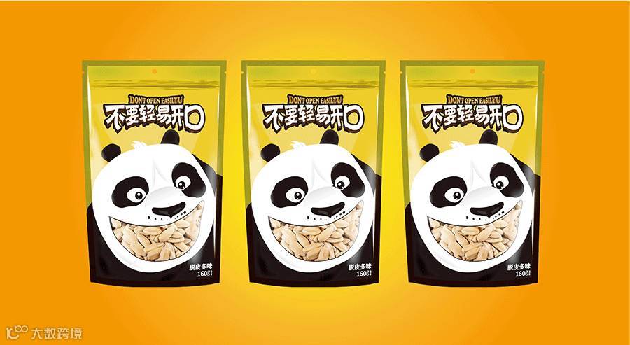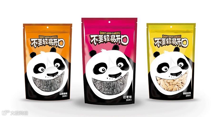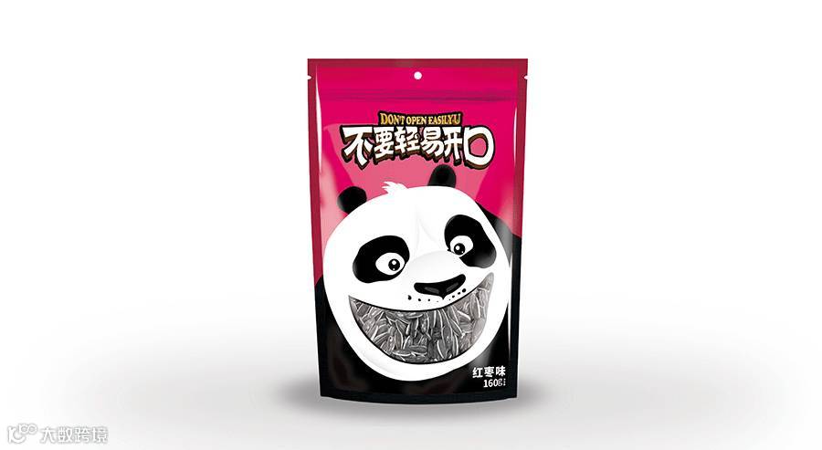 東德设计的包装主形象为大熊猫形象,因为大熊猫是我国珍稀动物,也被誉为我国“国宝”,其身富友好、和平、团结、欢乐、善意等等美好的象征,将其出乎意料的与休闲食品瓜子相融合在一起,精心策划设计熊猫张口吃瓜子的夸张表情,寓意瓜子的味道香甜。