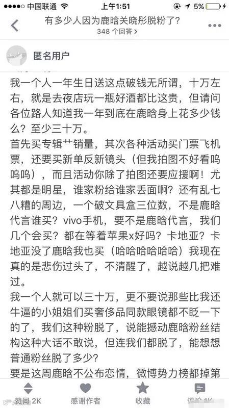 所以,不管是以前炒作的迪丽热巴还是这次的正牌女友关晓彤,都是被骂得体无完肤。知乎上有个话题“有多少人因为鹿晗关晓彤脱粉了”,其中有一个答案说一年为鹿晗至少花了30万,似乎可以佐证“女友粉”人财两空最终脱粉的观点。