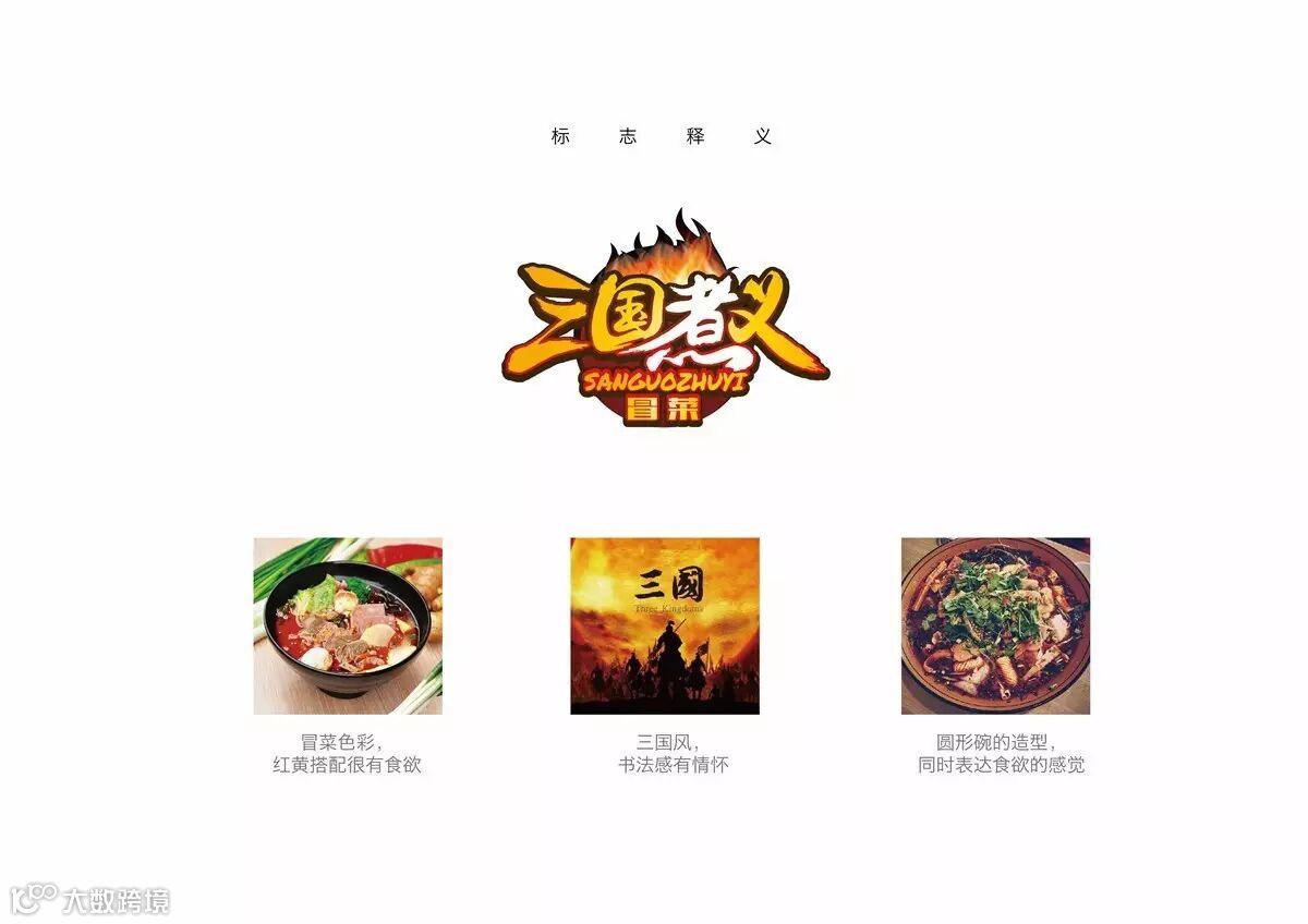 设计思路│创意来源: “三国煮义”的logo整体传达的是一种火辣辣,热腾腾的冒菜的感觉的标志符号。首先品牌的名字为三国煮义,那么我们很容易就会想到三国时候战火连天,英雄们豪情仗义,颜色选择红黄,既符合名字传达的音意,又符合冒菜本身的特点;再者标志外形选择了盛冒菜的圆碗的圆形,这样标志整体就像一碗煮好的冒菜一样,让消费者食欲大增,更能激起消费者购买欲。总之,三国煮义标志整体特点符合冒菜要传达给消费者的菜品特点,又独具创新意义,符合时代潮流。