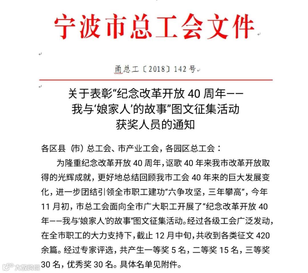2018年12月29日,宁波市总工会公布了一批“纪念改革开放40周年——我与‘娘家人’的故事”图文征集活动获奖名单,集团多名员工的作品在活动中获奖。其中,矿石公司员工张逢祥的作品《“娘家人”引领我人生出彩梦想成真》荣获一等奖,北二集司员工吴允元的作品《驶向远方的小纸船》荣获二等奖,矿石公司退休员工邵留芳的作品《想起在“娘家”的日子》、矿石公司员工蒋晓东的作品《图说北仑港四十年变迁》荣获三等奖,矿石公司员工齐磊的作品《生命的真谛在于奉献——记我的娘家人吴雄文》荣获优秀奖。(贺天星 蒋晓东)