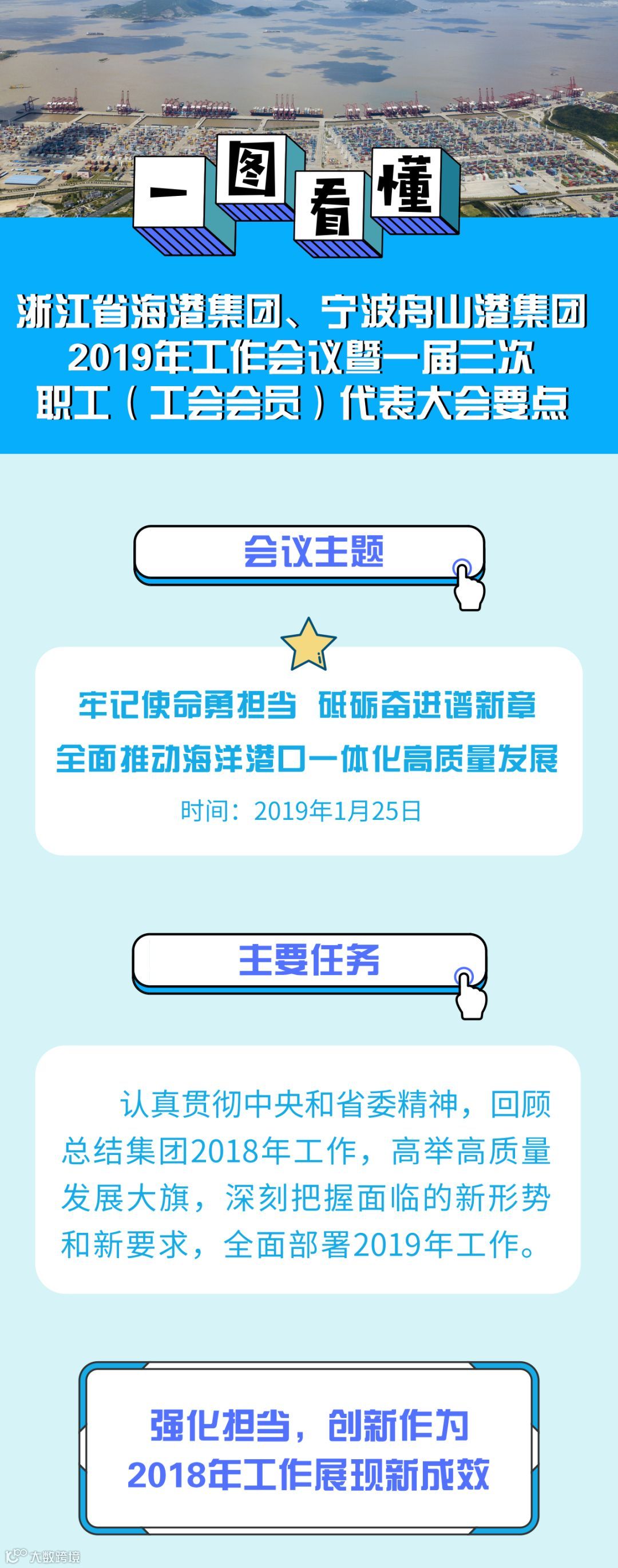1月25日,浙江省海港集团、宁波舟山港集团召开2019年工作会议暨一届三次职工(工会会员)代表大会,回顾总结集团2018年工作,高举高质量发展大旗,深刻把握面临的新形势和新要求,全面部署2019年工作。会议明确,集团2019年目标定位是“高质量、稳增长、求突破”。