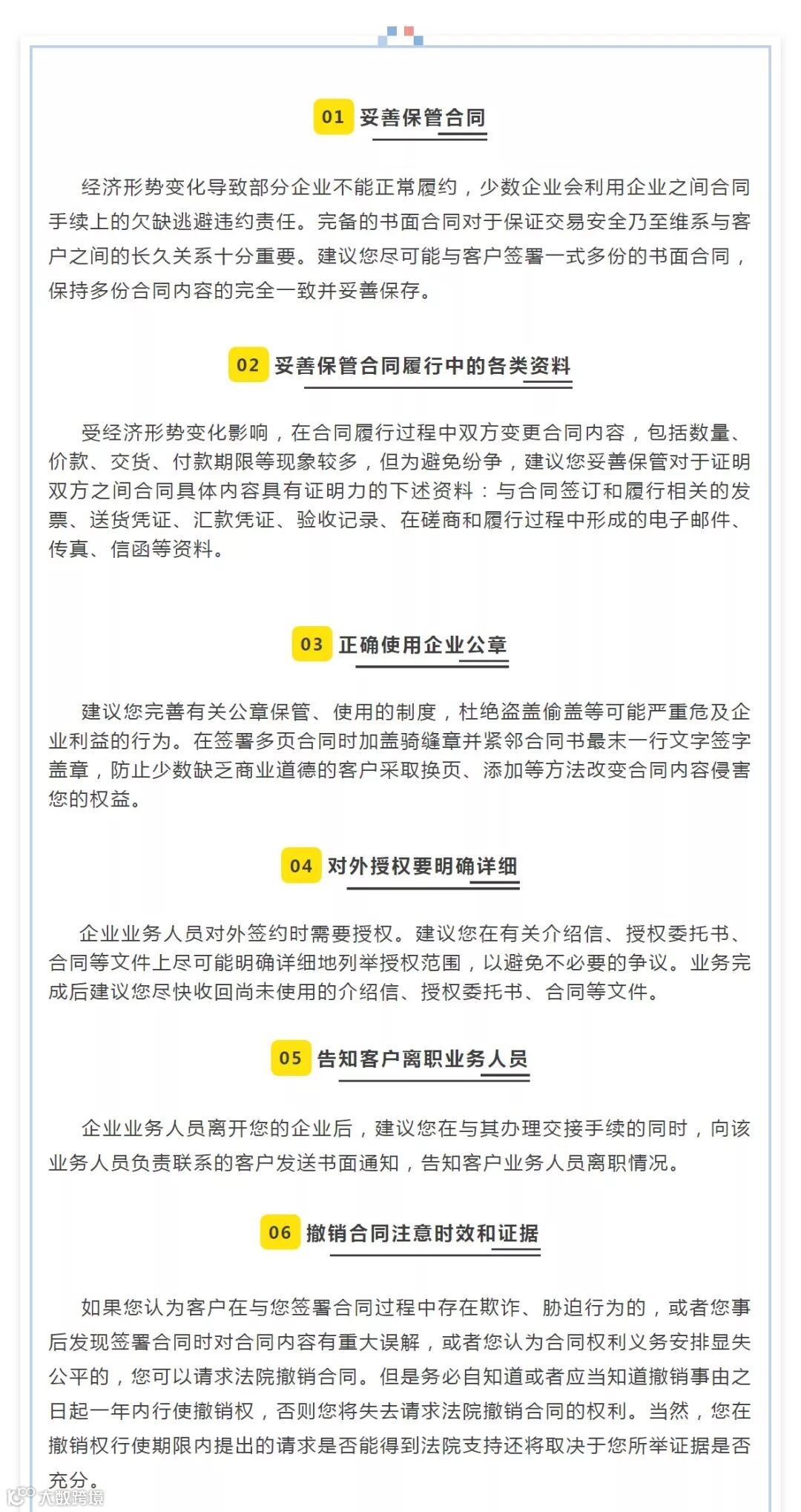 为防范法律风险,推进依法治企,从本期开始,“浙江海港”微信将分五期转载《关于当前宏观经济形势下企业防范经营法律风险的六十项提示》,包括合同订立和履行过程中的注意事项、企业治理和劳动用工方面的注意事项、以及企业知识产权保护方面和涉外贸易交往中应注意的事项等内容,供大家学习。