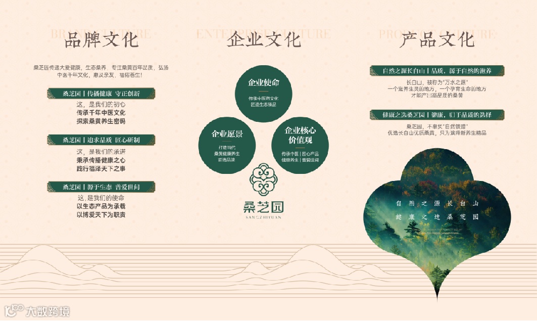 提炼「自然之源长白山,健康之选桑芝园」作为品牌传播口号,对仗工整,突出桑芝园的核心品牌优势。