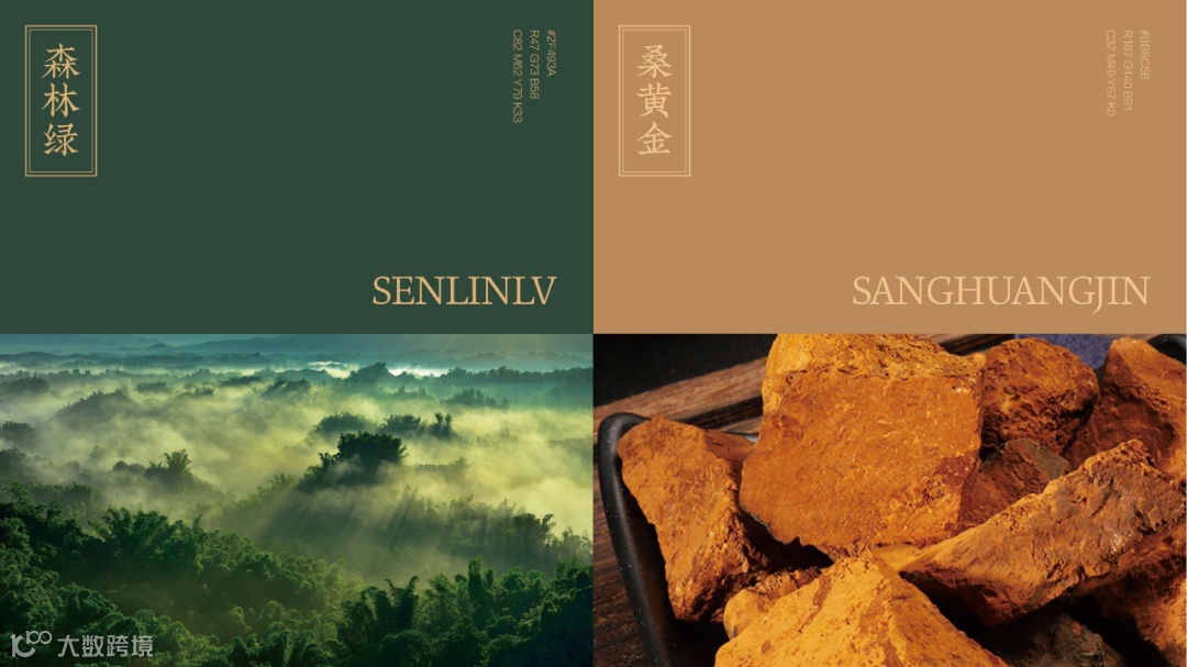 「森林绿」自然健康,「桑黄金」珍贵典雅,提取二者为品牌主色,符合品牌“生态桑养”的核心价值传递,将源自长白山的生态健康带给国人,帮助品牌建立生态、高端的升级印象。