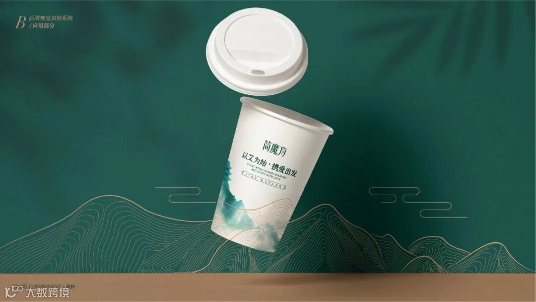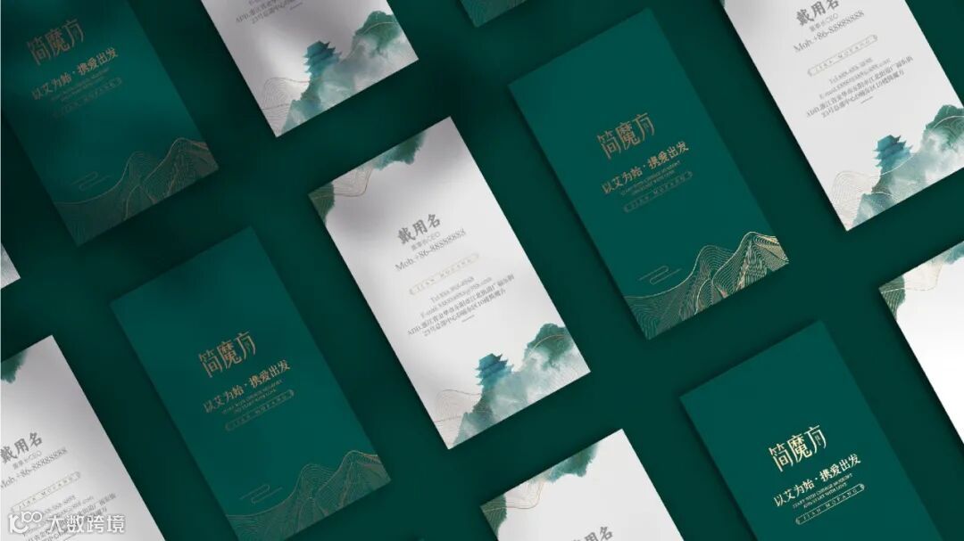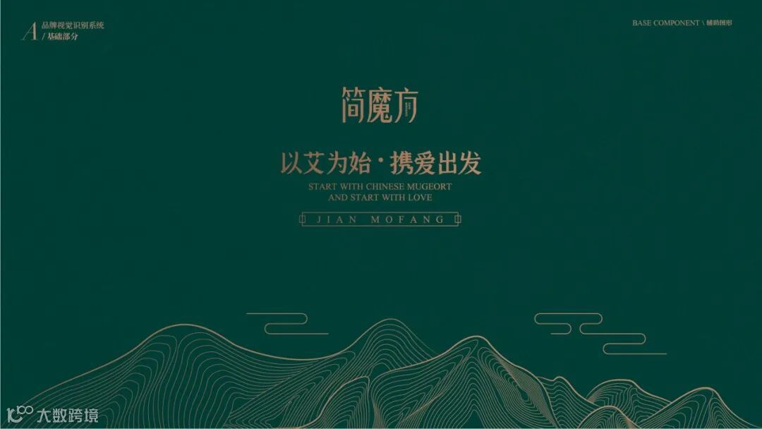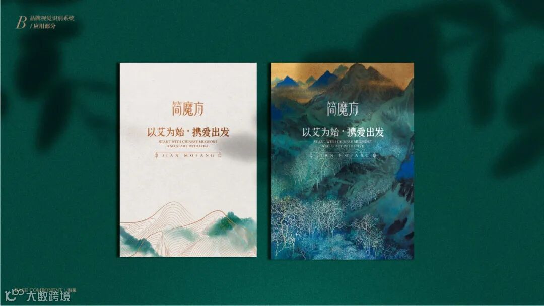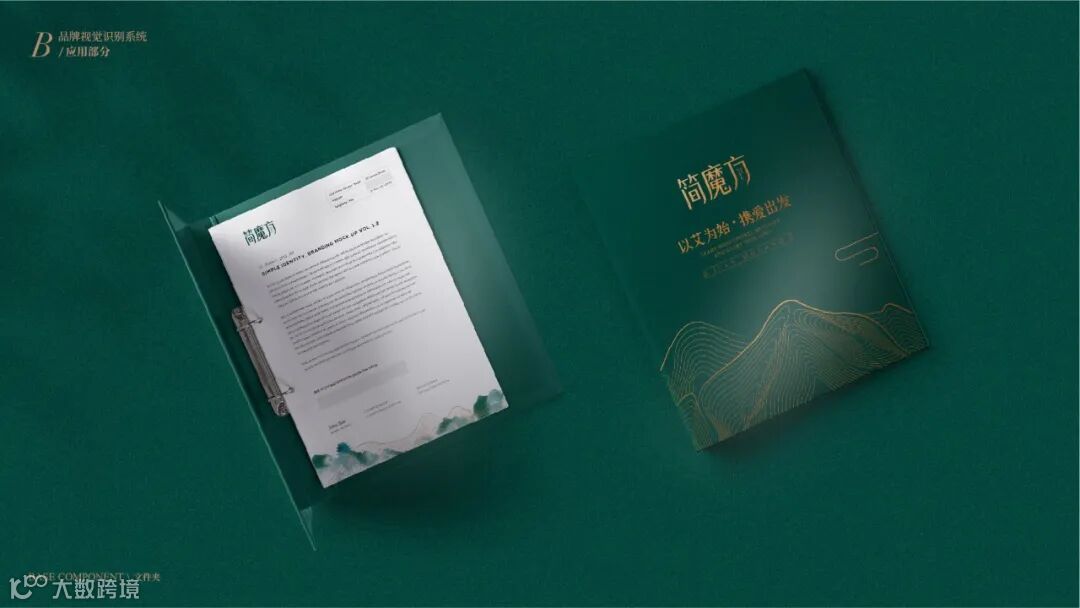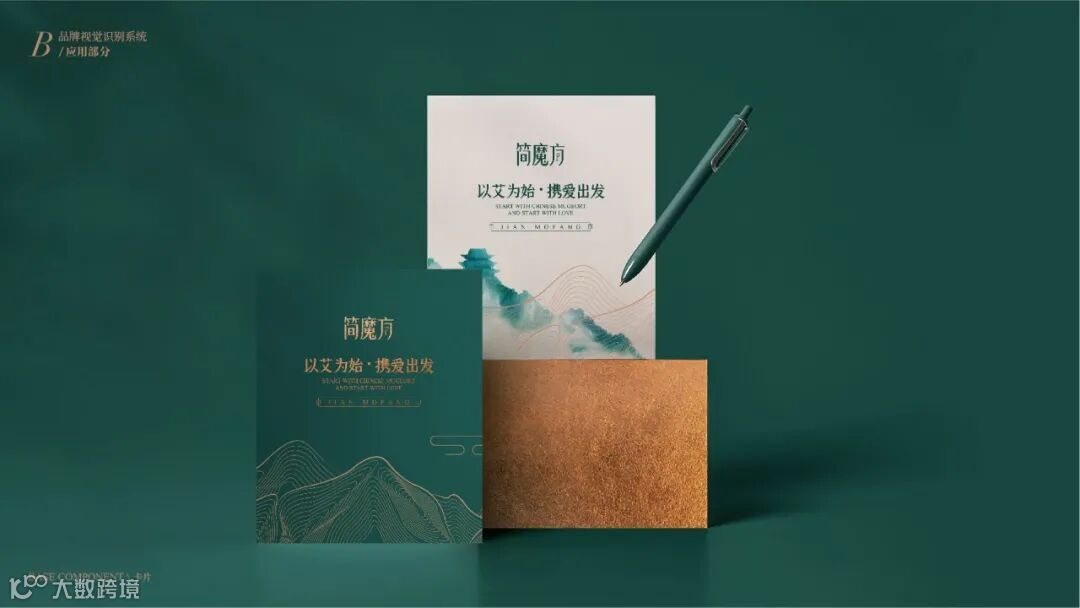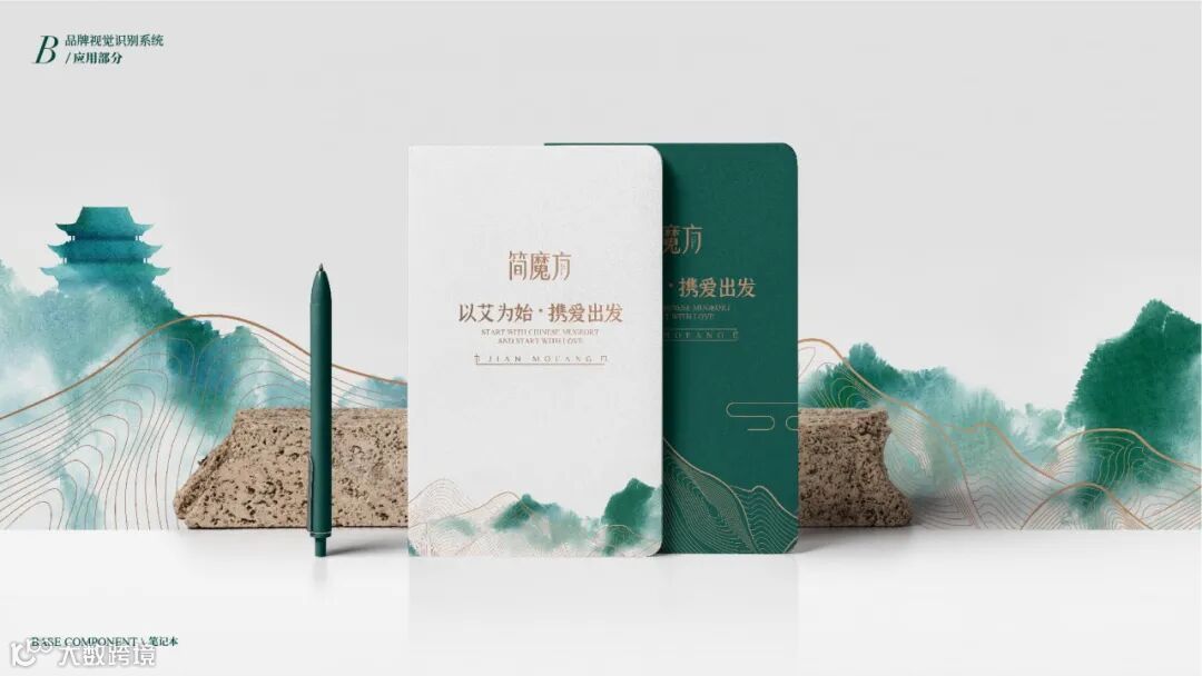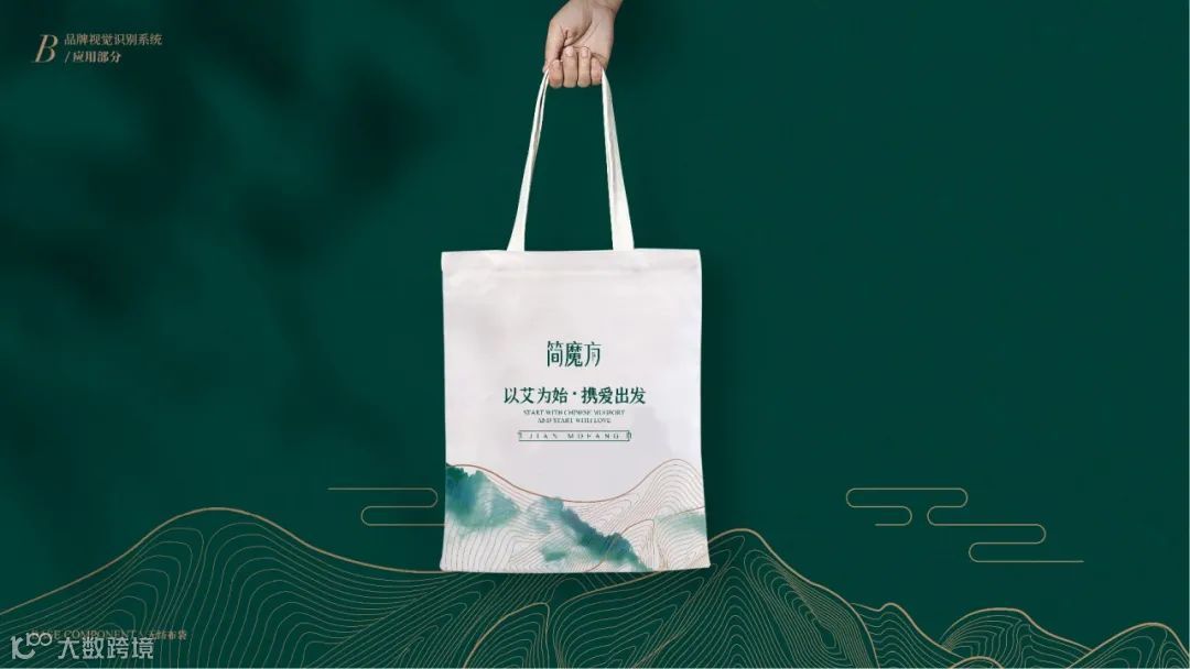 VI系统运用了从中国传统水墨中抽象出的山水线条,既保证了VI多场景实际运用的标准性,也彰显出简魔方传承自然健康的理念!“以艾为始,携爱出发”,简魔方,将品牌口号融入VI之中,让传播无处不在,将简魔方“传艾四方”的声音,随着山水线条绵延开来!