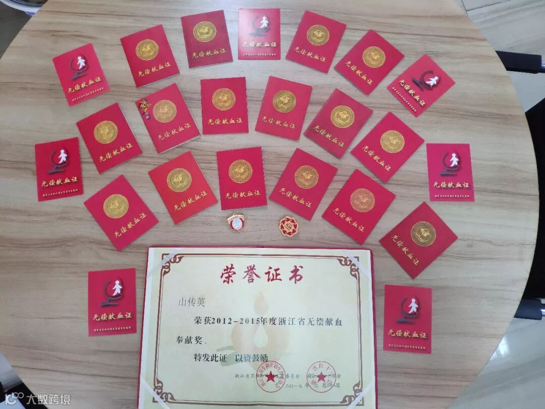 “爱不分地域,上面的每一次记录都代表着爱的延续。”12年间,她已经“书写”了20多本《爱的飞行日记》,也收获到了意想不到的果实。去年,她荣获2012-2015年度浙江省无偿献血奉献奖;今年,她以全血7600CC和血小板11单位,共49次的献血次数,荣获了全国献血奉献奖金奖……
