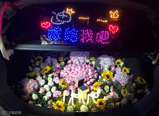 在车里,男友说后备箱里有个宝贝,让我去瞧瞧。打开后备箱,满箱的鲜花!万万没想到,这么浪漫的情节会发生在我身上。因为前几天,他还说钻戒要晚半个月才能拿到,没想到这个直男还会求婚!