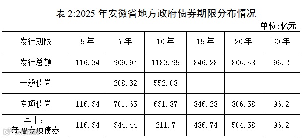 2025年安徽省政府债券发行以7年期(含)以上为主,占发行总量97%。债券平均发行期限12.76年,较上年缩短0.22年。一般债券平均发行期限9.18年,专项债券平均发行期限13.61年,其中:新增专项债券平均发行期限14.43年。(见表2)
