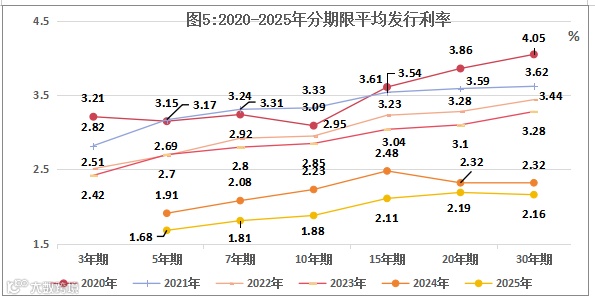 2.历年发行利率对比。2020年-2025年,安徽省政府债券分期限平均发行利率走势(见图5)。