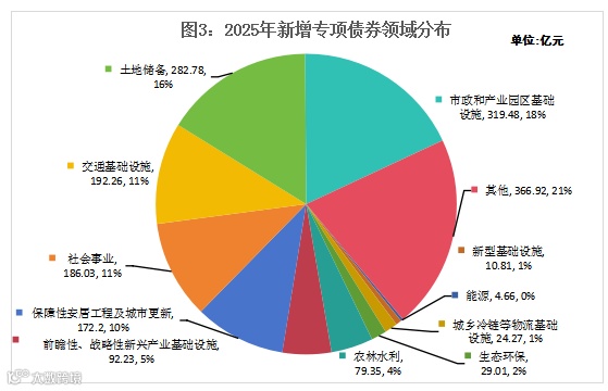 3.从投向领域看,用于项目建设的新增专项债券资金共支持1615个专项债券项目,主要用于市政和产业园区基础设施319.48亿元、土地储备282.78亿元、交通基础设施192.26亿元、社会事业186.03亿、保障性安居工程172.2亿元,五项合计占比达65%(见图3)。此外,安排161.24亿元用作项目资本金,占项目建设专项债券资金的12%,重点投向交通基础设施、新型产业基础设施等领域。