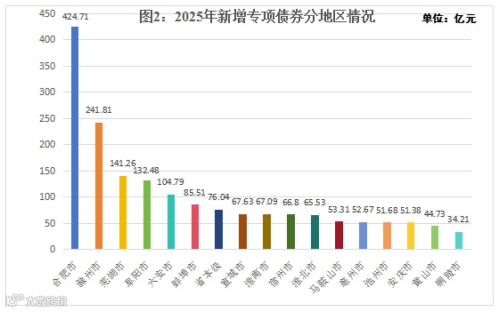 2.从发行地域看,合肥市新增专项债券发行规模424.71亿元,居全省首位;黄山市、铜陵市发行规模较小,分别为44.73亿元和34.21亿元(见图2)。