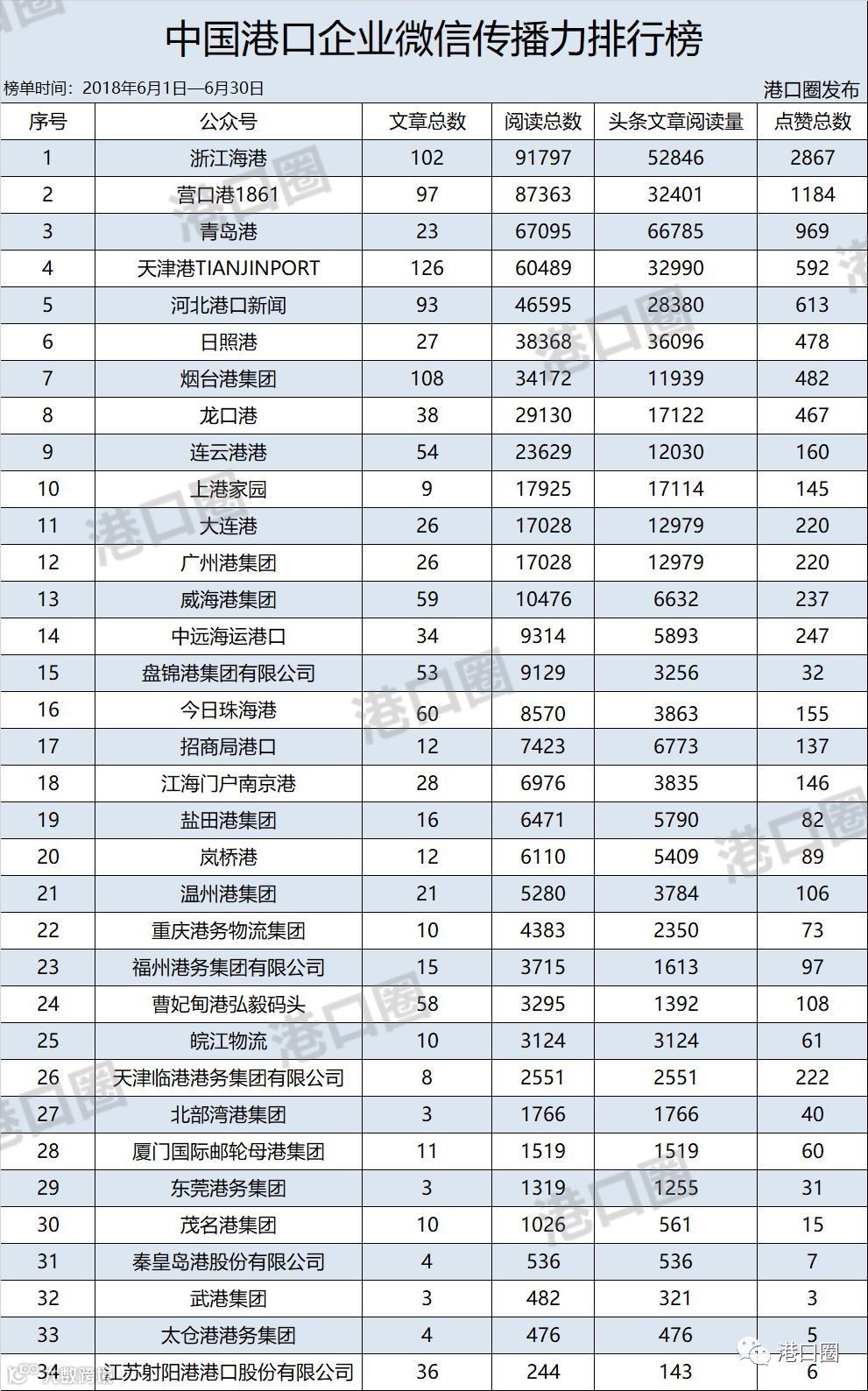 7月2日,港口圈发布“中国港口企业微信传播力排行榜第9期”。此次有34家港口企业微信公众号上榜。榜单涉及文章总数、阅读总数、头条文章阅读量、点赞总数四个维度。