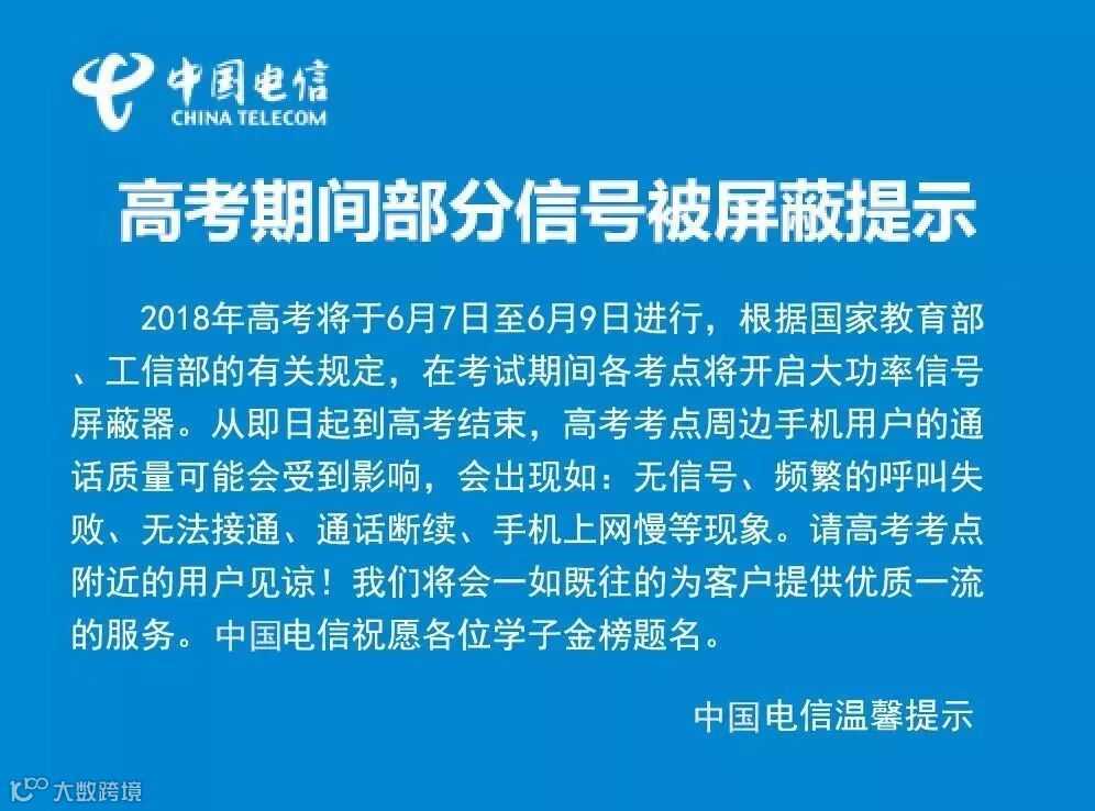 高考期间,为了避免手机通信影响考试,为了创造一个公平的环境(防止考生作弊等不文明行为),三大运营商陆续发布关于《高考期间部分信号被屏蔽提示》。