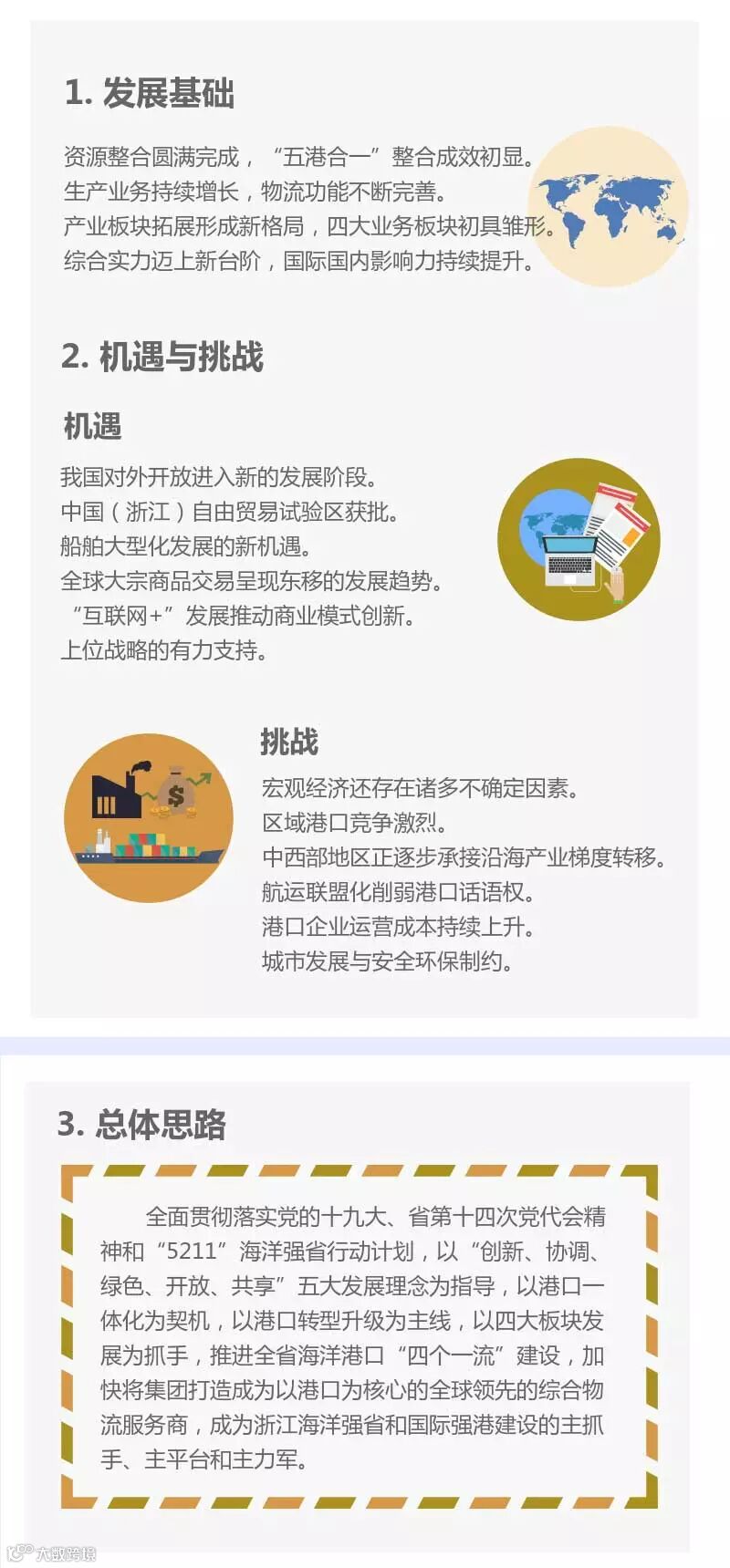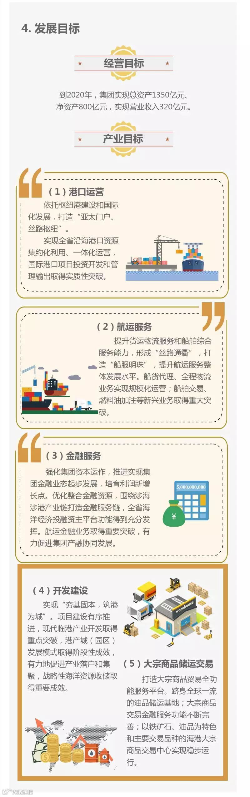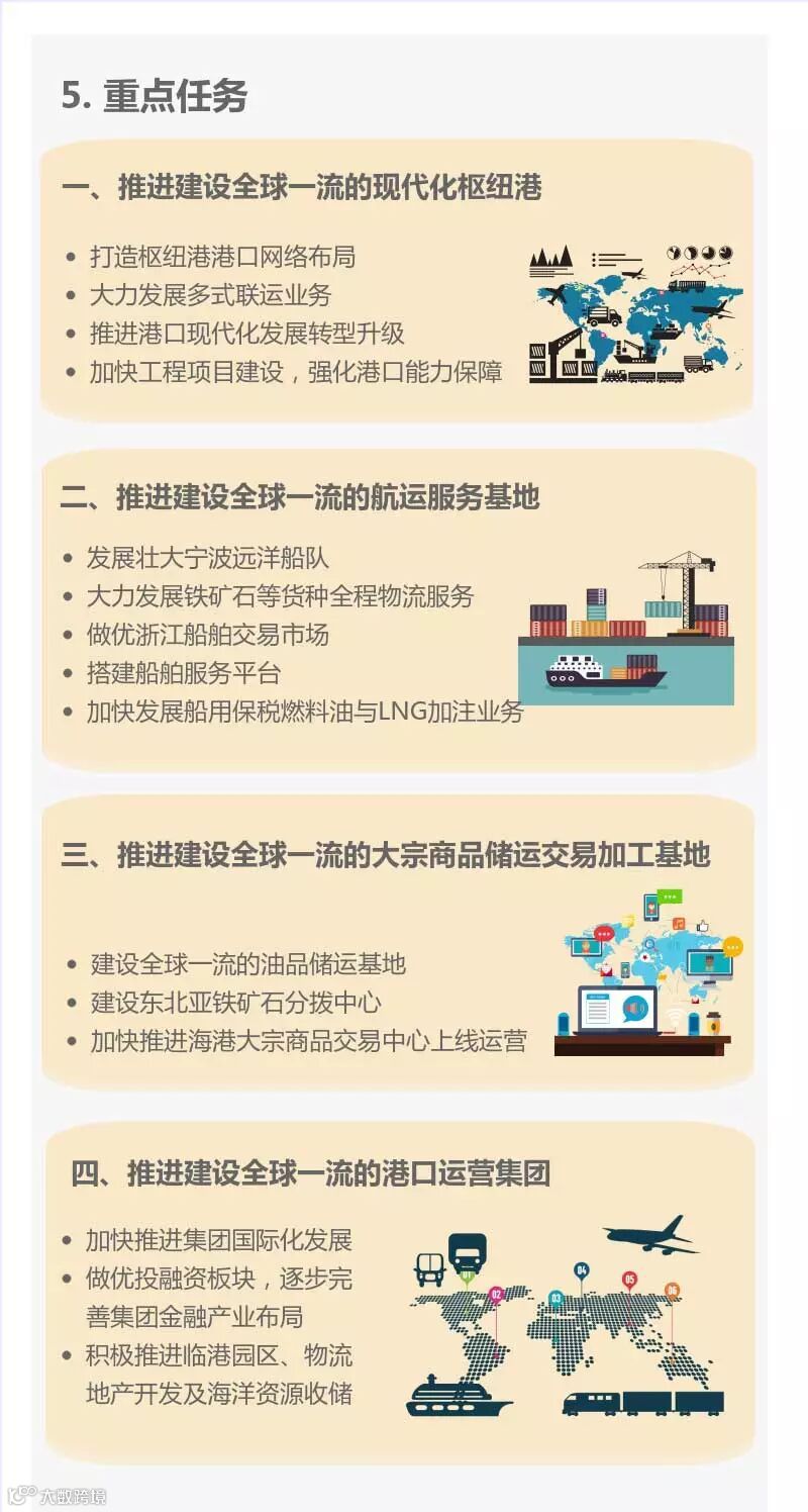 近日,浙江省海港集团、宁波舟山港集团印发了“十三五”发展规划。此规划是在原《浙江省海港投资运营集团有限公司“十三五”规划(送审稿)》和《宁波舟山港集团有限公司“十三五”规划》基础上,根据两集团深化整合、全面融合的发展要求重新修编而成。我们通过图解的方式,分期解析集团“十三五”规划,明确“十三五”的发展目标和重点任务举措,进一步统一思想、凝心聚力,推动集团“十三五”规划的贯彻落实。