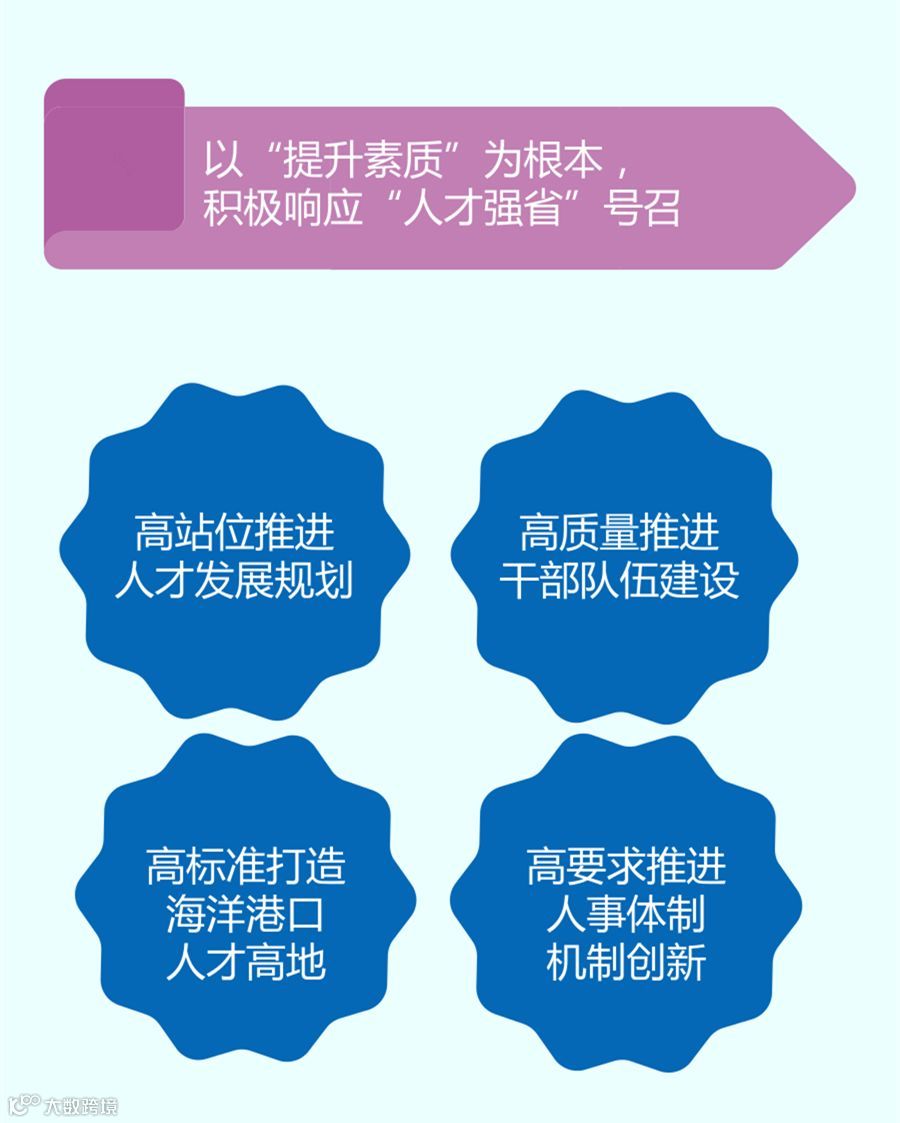 2018年1月30日,浙江省海港集团、宁波舟山港集团董事长、党委书记,宁波舟山港股份有限公司董事长毛剑宏在集团2018年工作会议暨一届二次职工(工会会员)代表大会上指出:以“提升素质”为根本,积极响应“人才强省”号召。人才资源是第一资源,人才工作既是党务,也是关系企业发展的要务。当今世界的竞争,归根到底是人才的竞争。要全面贯彻落实省人才工作会议精神和《高水平建设人才强省行动纲要》,牢固树立“人才强企”的工作导向,创新人才引进、培养、使用、评价、激励机制,努力打造人才生态最优企业。