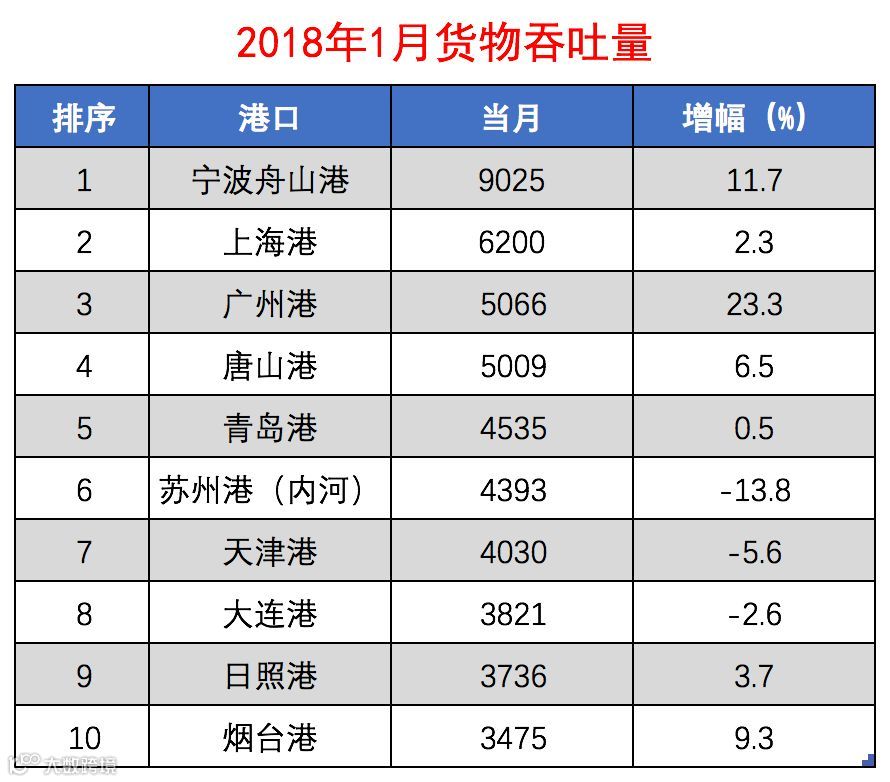 日前,交通运输部公布了2018年1月全国规模以上港口货物吞吐量。全国规模以上港口1月份共完成货物吞吐量10.83亿吨,同比增长3.5%。其中,沿海港口完成货物吞吐量7.67亿吨,同比增长4.7%;内河港口完成货物吞吐量3.16亿吨,同比增长0.3%。1月份,全国规模以上港口共完成集装箱吞吐量2058.18万标准箱,同比增长8.7%。其中,沿海港口完成1842.58万标准箱,同比增长8.6%;内河港口完成集装箱吞吐量215.59万标准箱,同比增长9.5%。
