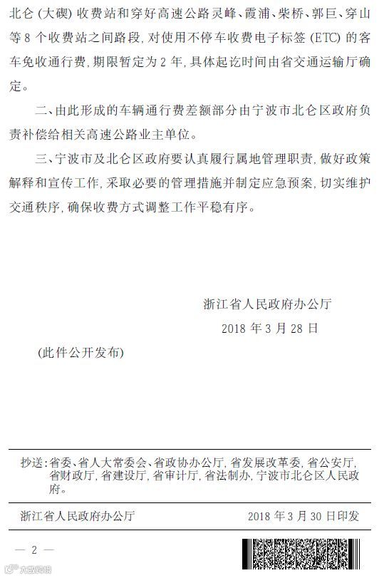 根据文件,北仑境内高速客车通行将实行免费,具体涉及丁家山、小港,北仑(大碶)、灵峰、霞浦、柴桥、郭巨、穿山等8个收费站,符合条件的车辆在这8个收费站间上下高速,可以享受到免收通行费的优惠。