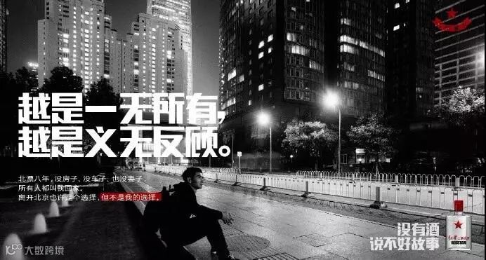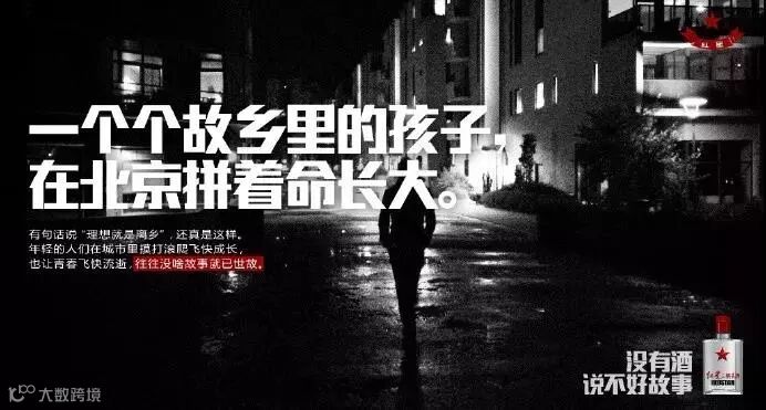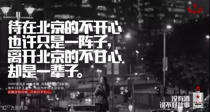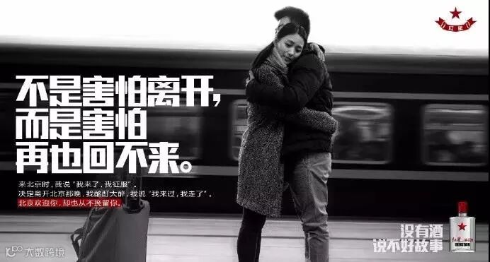 文案类银奖:北漂故事系列 红星二锅头与省广集团合作的这套文案,将目标对准北漂青年,将漂泊在外的游子的孤独感刻画了出来。 这套文案对于在外打拼的人们,不仅仅是走心了,而是扎心,文案刚出来时,也小小的刷过一次屏。 红星与省广集团合作出品的这套平面文案,获得了广告节文案类银奖。