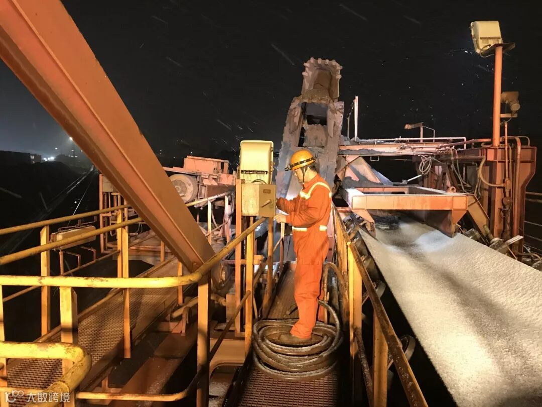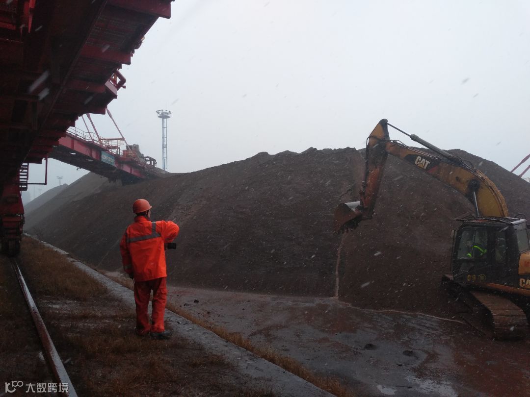 北仑矿石码头分公司2号斗轮机旁,斗装司机马亮正在风雪中指挥斗轮机、挖机同时作业。