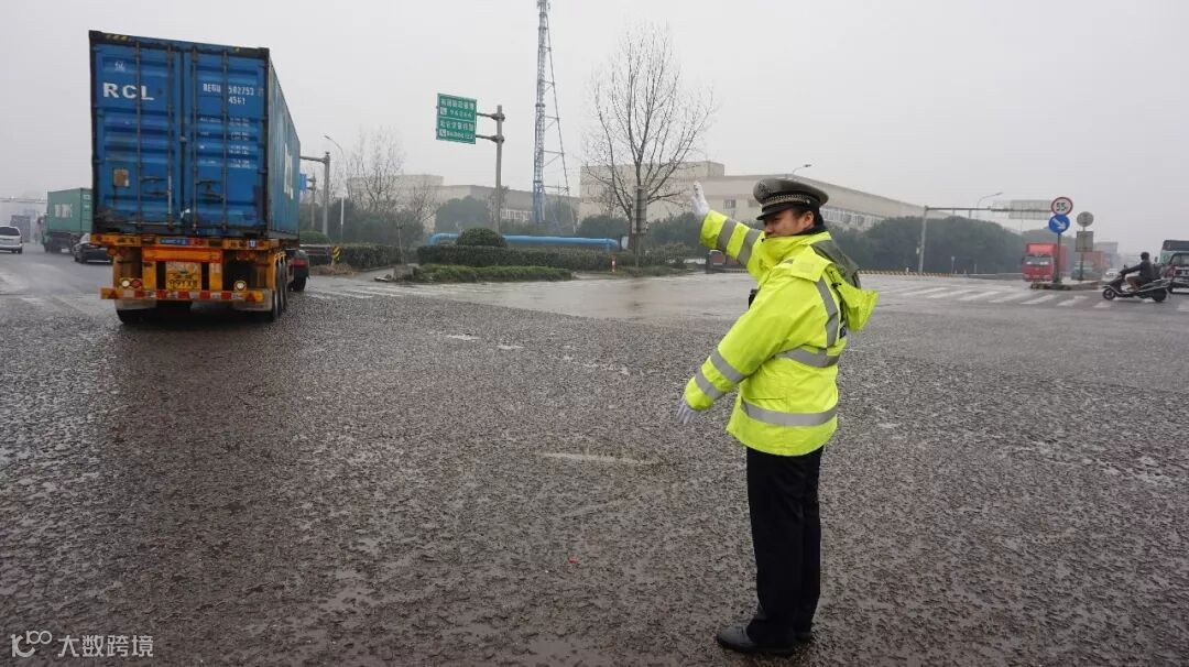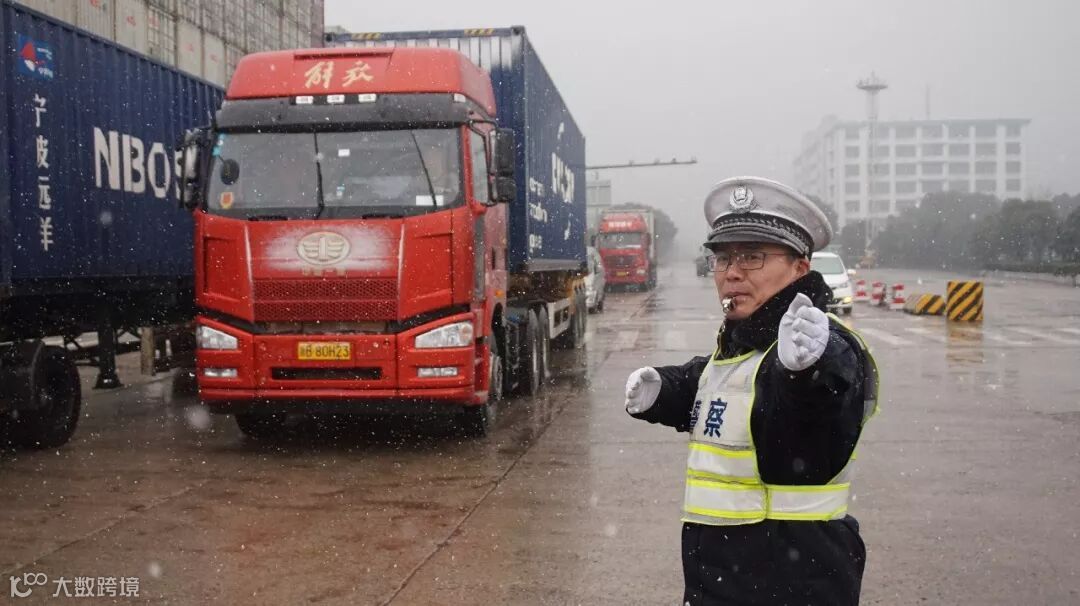 宁波港公安局的干警们为保证交通行车安全,在风雪中坚守在各个路口,为集卡司机们保驾护航。