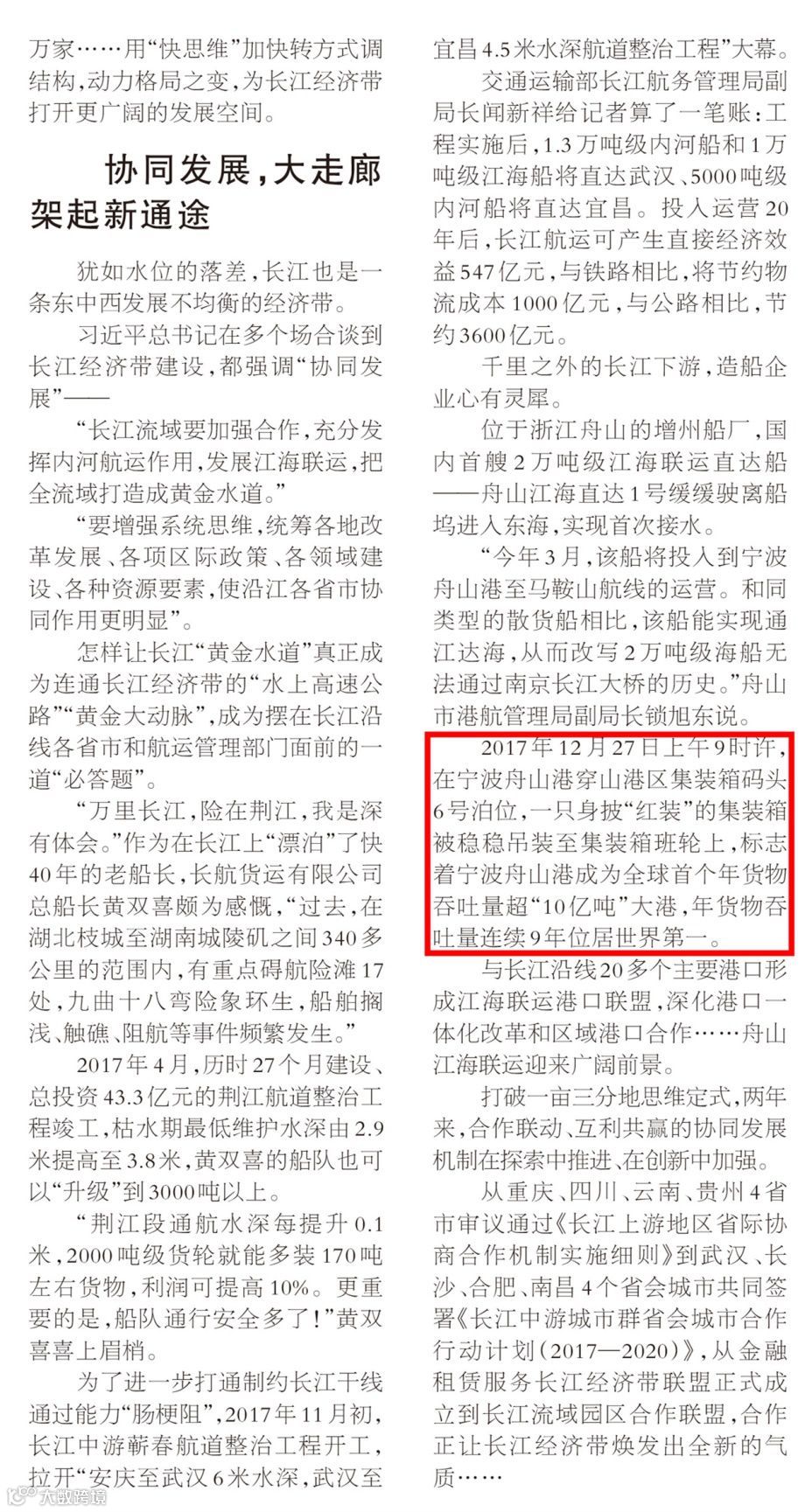 在该文中,宁波舟山港作为我国江海联运的重要节点和全球首个年货物吞吐量超10亿吨大港,引起了记者的关注。